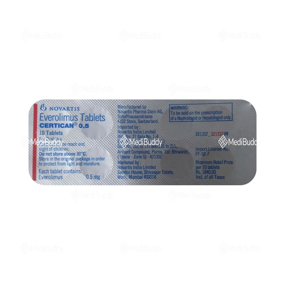 Before consuming Certican 0.5 Tablet, it is crucial to adhere to the prescribed dose and duration. It can be taken with or without food but maintain consistency in the timing. An overdose can lead to serious side effects. Common side effects may include infection, fever, cough, fatigue, diarrhea, and upper respiratory infection. If any side effects persist, contact your doctor immediately. Seek medical advice if you experience allergic reactions. Inform your doctor if you face increased thirst or urination frequency, shortness of breath, cough, fever, or require vaccinations during the medication course. Prior to using this medicine, consult your doctor if you are already taking other medications or have any underlying condition. Pregnant or breastfeeding women should notify their doctor. Regular laboratory tests may be recommended during treatment to monitor the medicine's effects. Consult your doctor if you plan to conceive as this medicine may impact fertility.