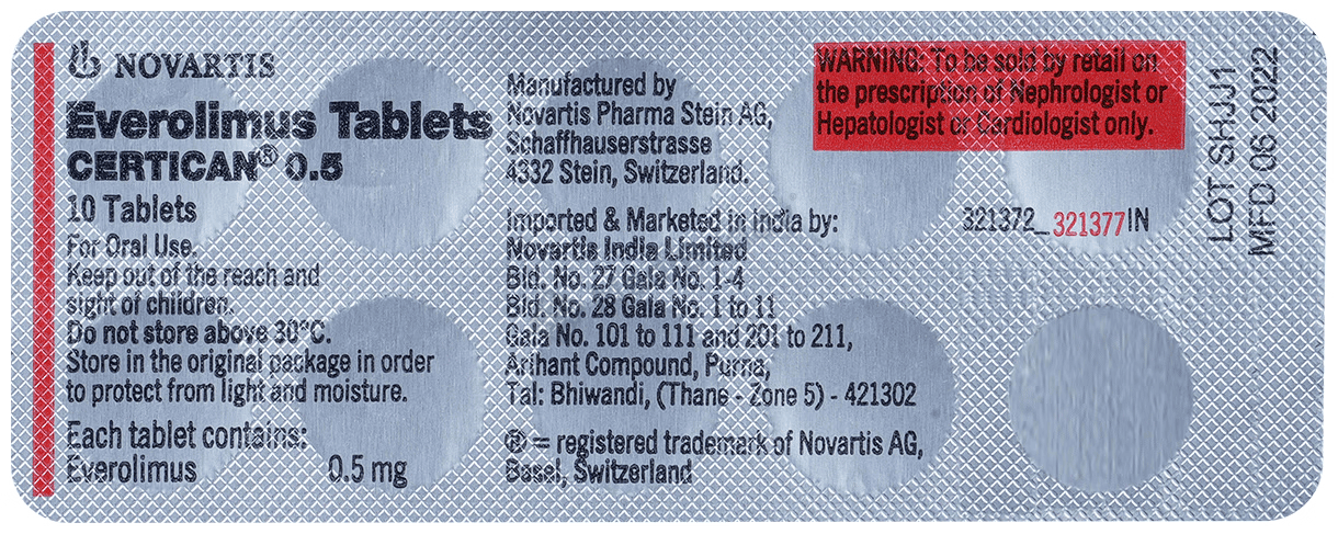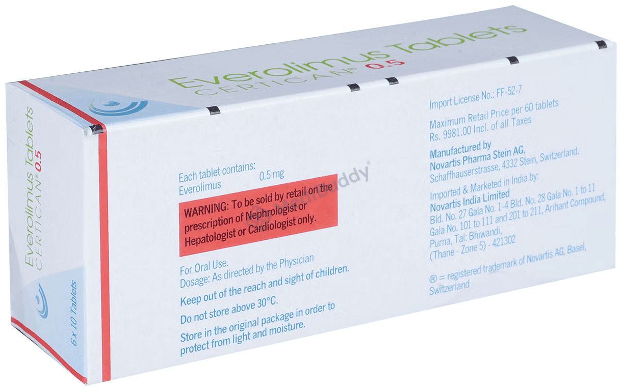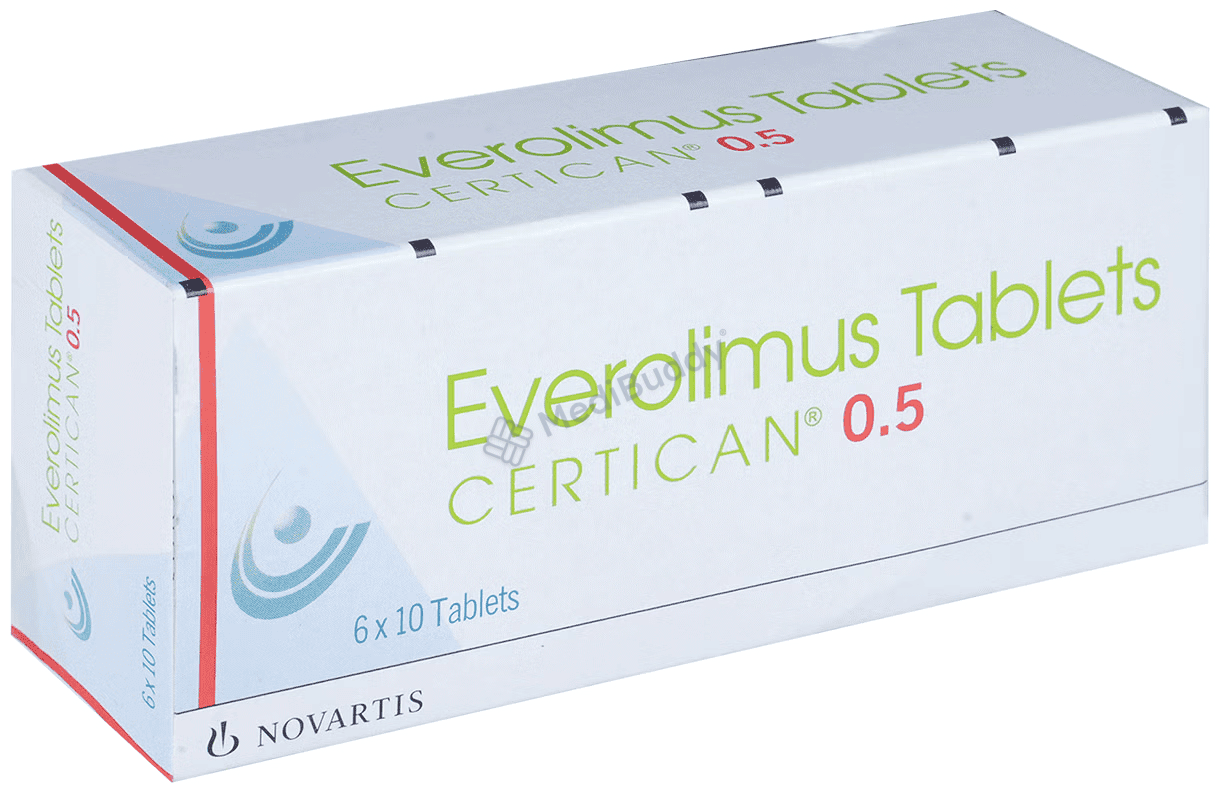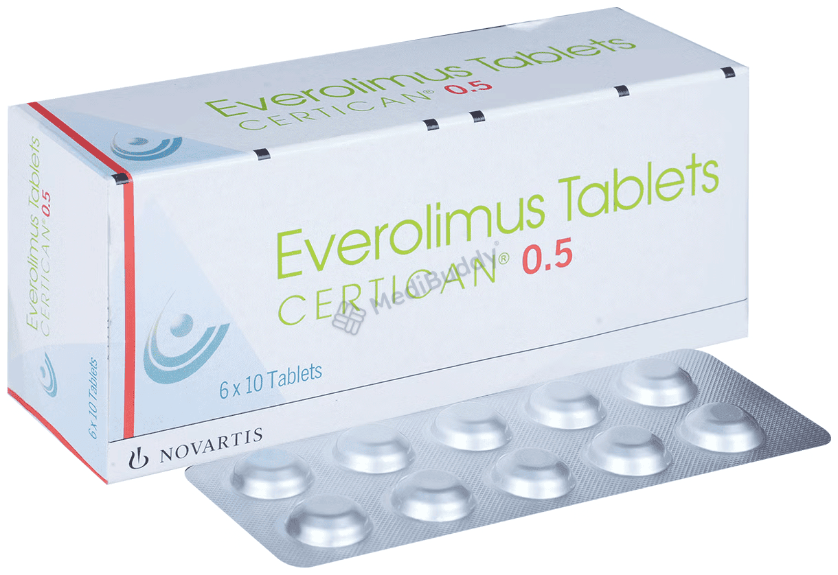 Certican 0.5 Tablet is an essential medication used to prevent the rejection of organs in transplant patients. It plays a crucial role in regulating the body's immune response, enabling the acceptance of new organs. Additionally, this tablet is utilized in conjunction with other medications to combat various types of cancers such as breast, pancreas, lungs, and kidney cancer.