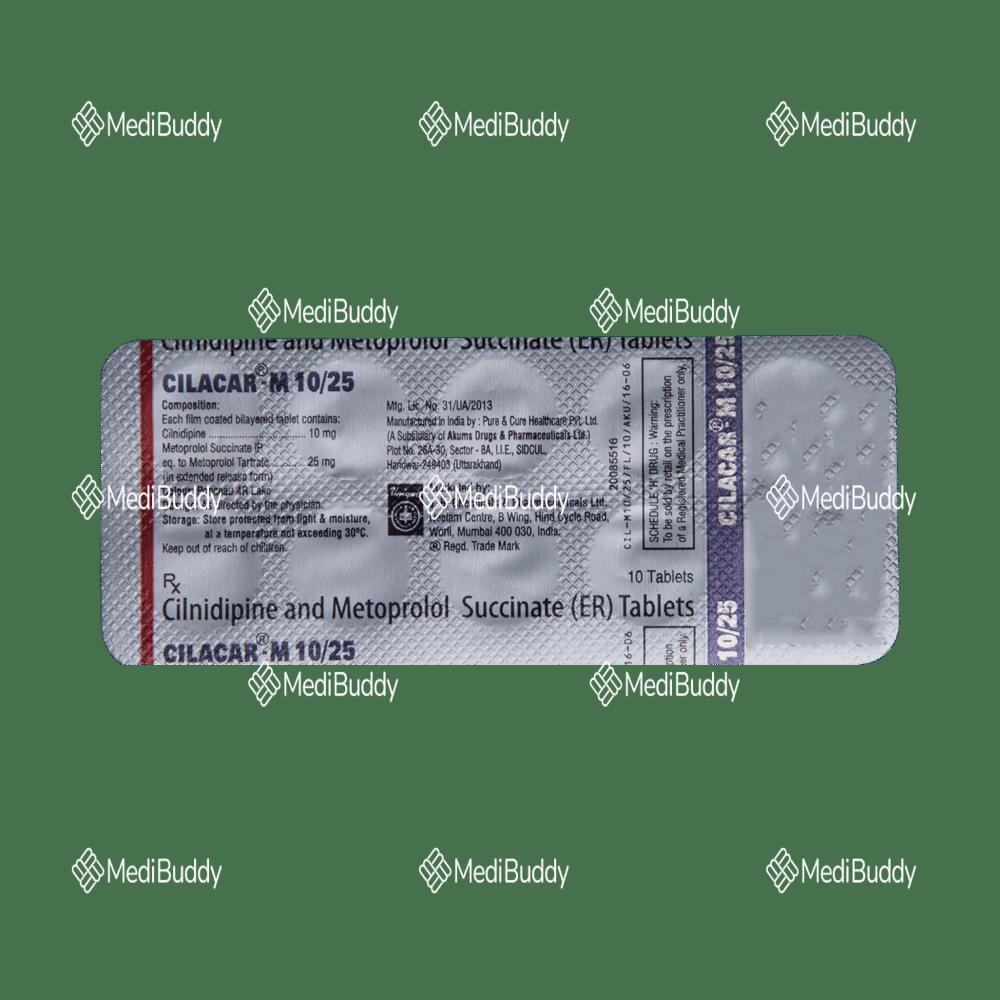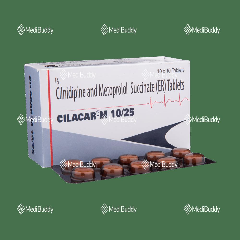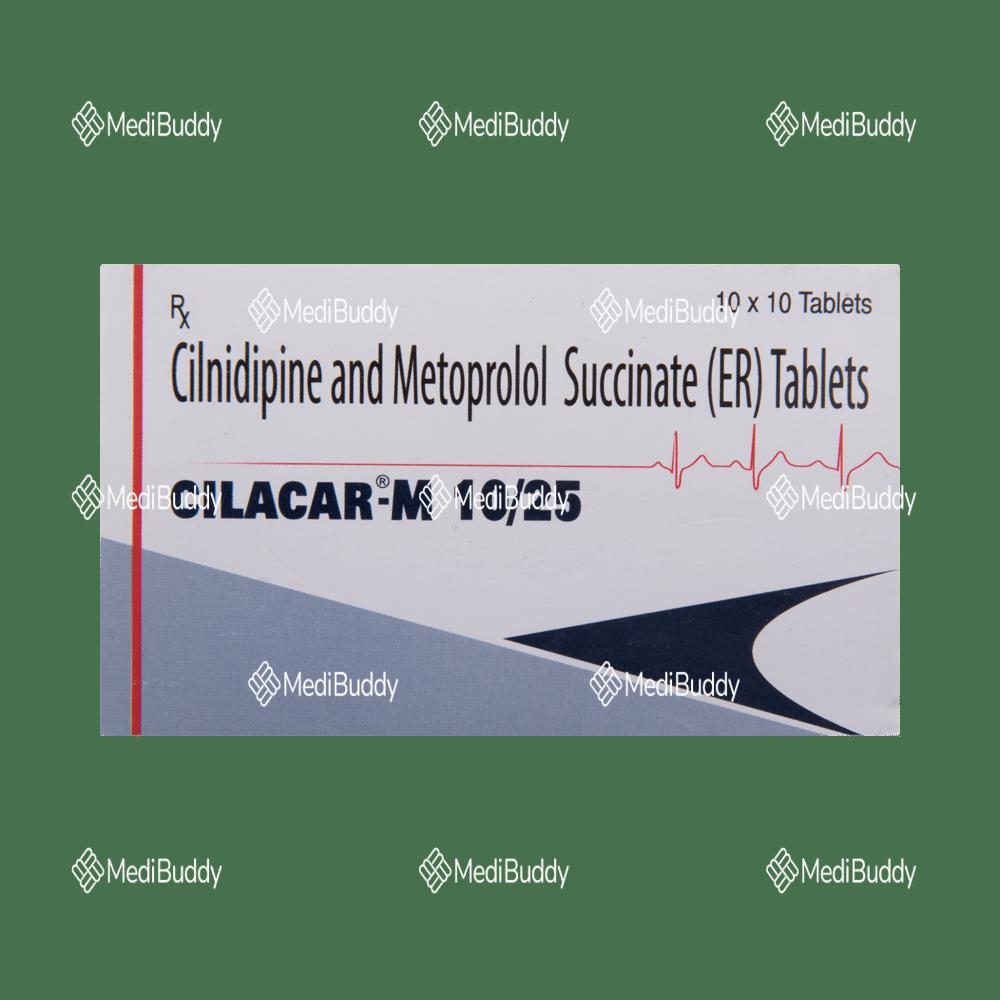 Cilacar-M 10/25 Tablet ER is used to manage hypertension (high blood pressure). It contains two medications that work together to control blood pressure. By lowering blood pressure, it helps prevent potential heart attacks and strokes. Consistent daily intake is important, even if you feel fine, as high blood pressure often presents no symptoms. Stopping the medicine abruptly may worsen your condition. Regular exercise, weight management, and a healthy diet can also assist in blood pressure control. You may experience side effects like headache, ankle swelling, slow heart rate, and nausea. Consult your doctor if side effects persist. Regular monitoring of blood pressure, kidney function, blood sugar, and electrolytes levels is recommended during treatment. Prior to taking this medication, inform your doctor of any liver or kidney issues. Pregnant or breastfeeding individuals should consult their doctor before using this medicine. It is important to disclose all other medications, especially those for high blood pressure or heart conditions, to your doctor.