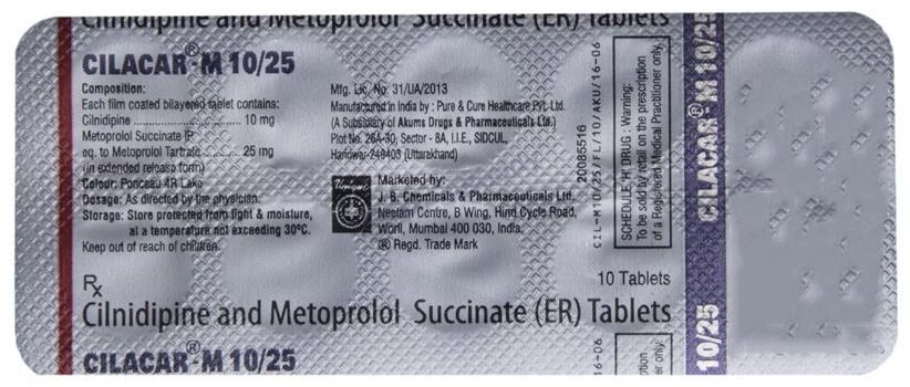 Overall, Cilacar-M 10/25 Tablet ER is a valuable treatment option for hypertension, helping to reduce blood pressure and lower the risks of heart-related complications. It is important to adhere to the prescribed regimen, monitor any potential side effects, and follow the guidance of your healthcare provider for optimal management of hypertension.