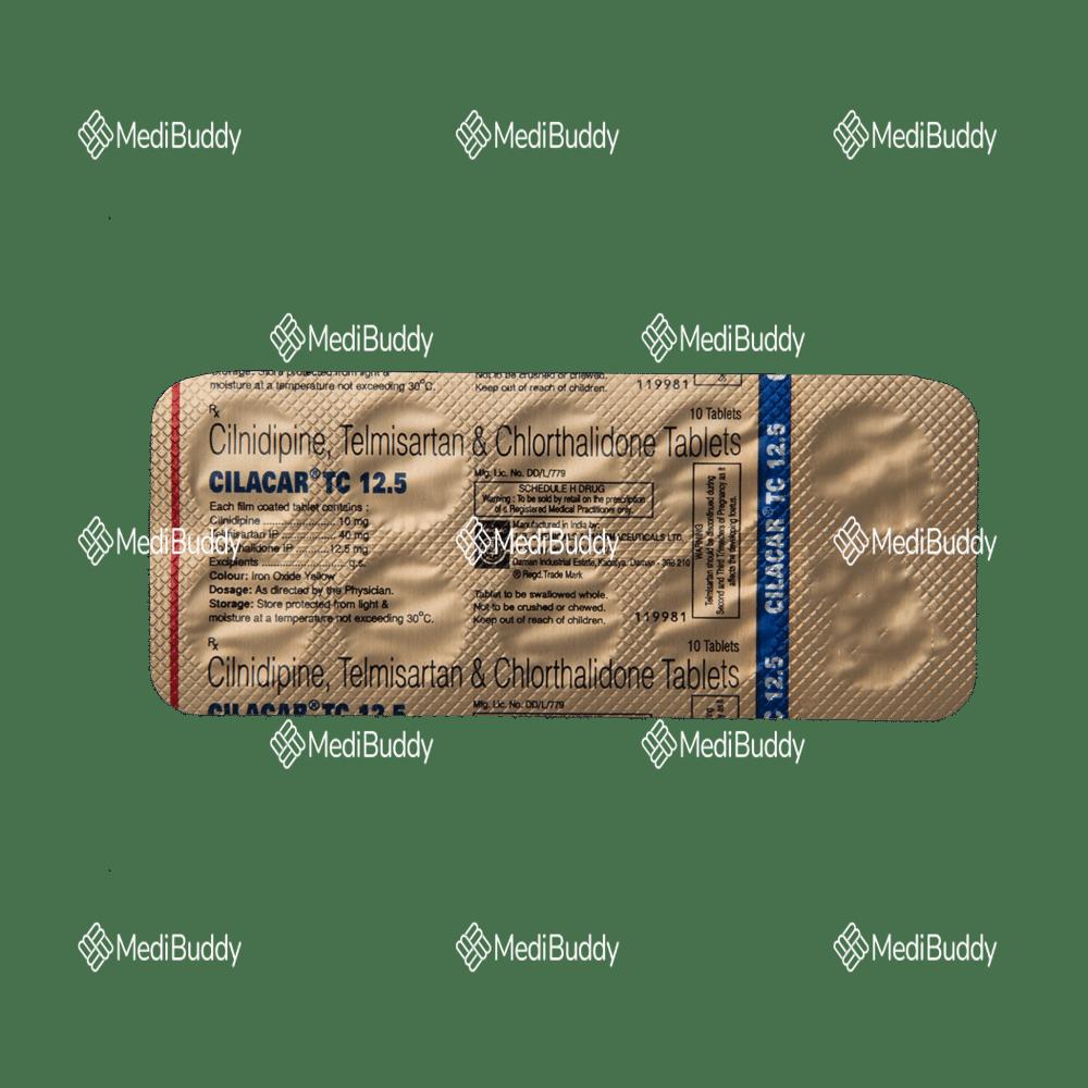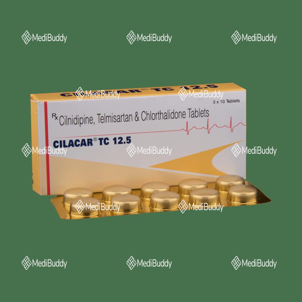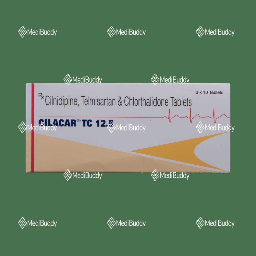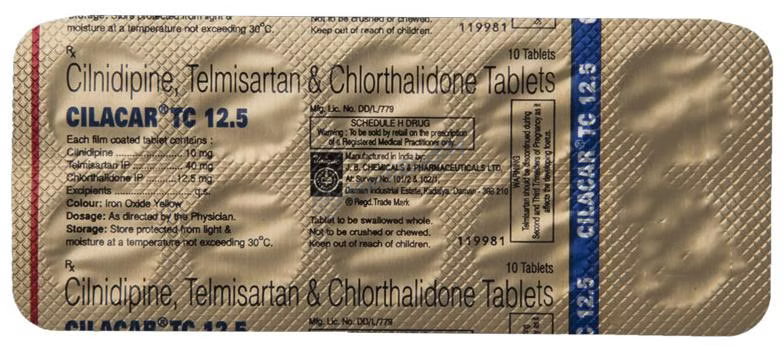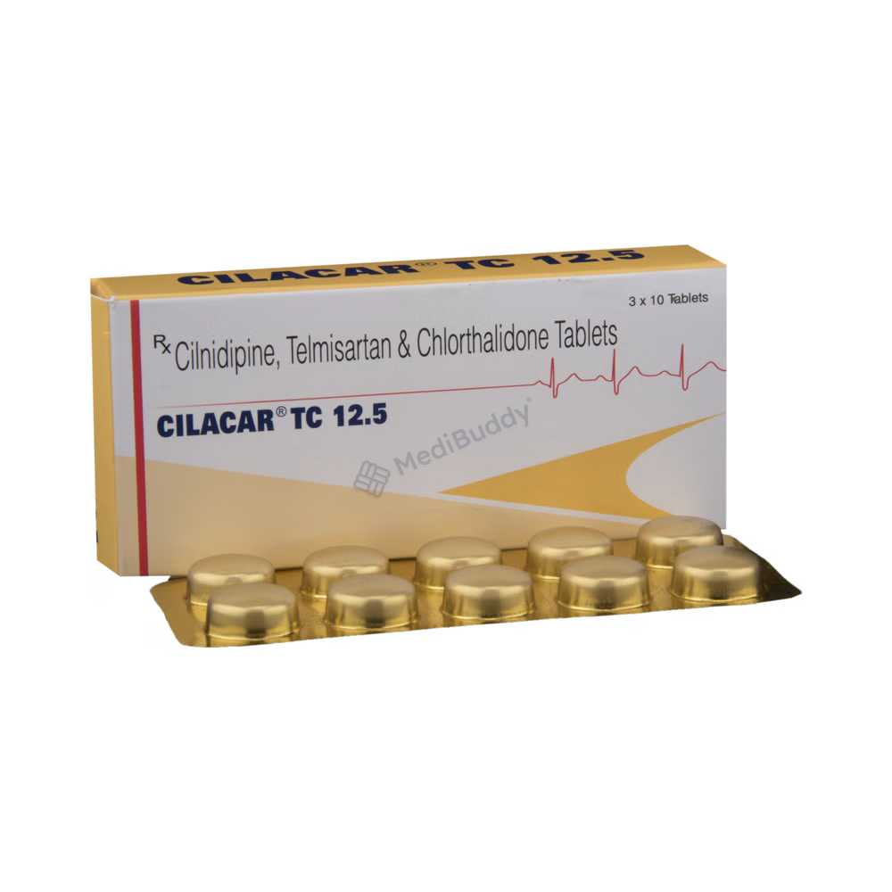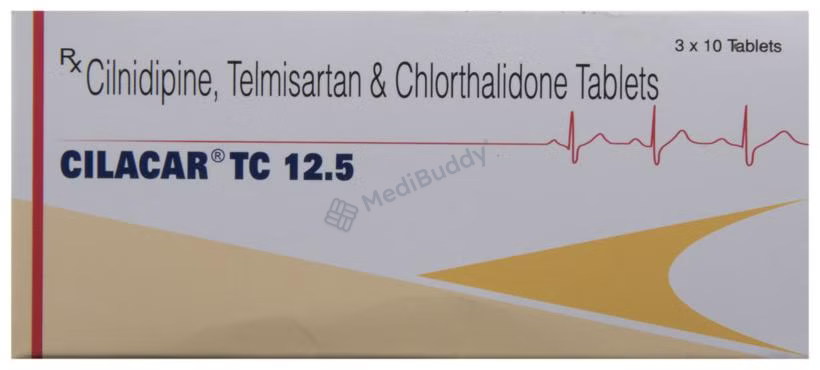 Cilacar TC 12.5 Tablet is a medication used to treat high blood pressure in individuals for whom a single medication is not sufficient. It is essential in lowering high blood pressure levels, which in turn reduces the risk of future heart attacks and strokes. This tablet consists of three active ingredients: Chlorthalidone, Cilnidipine, and Telmisartan. These components work together to effectively manage hypertension by different mechanisms.