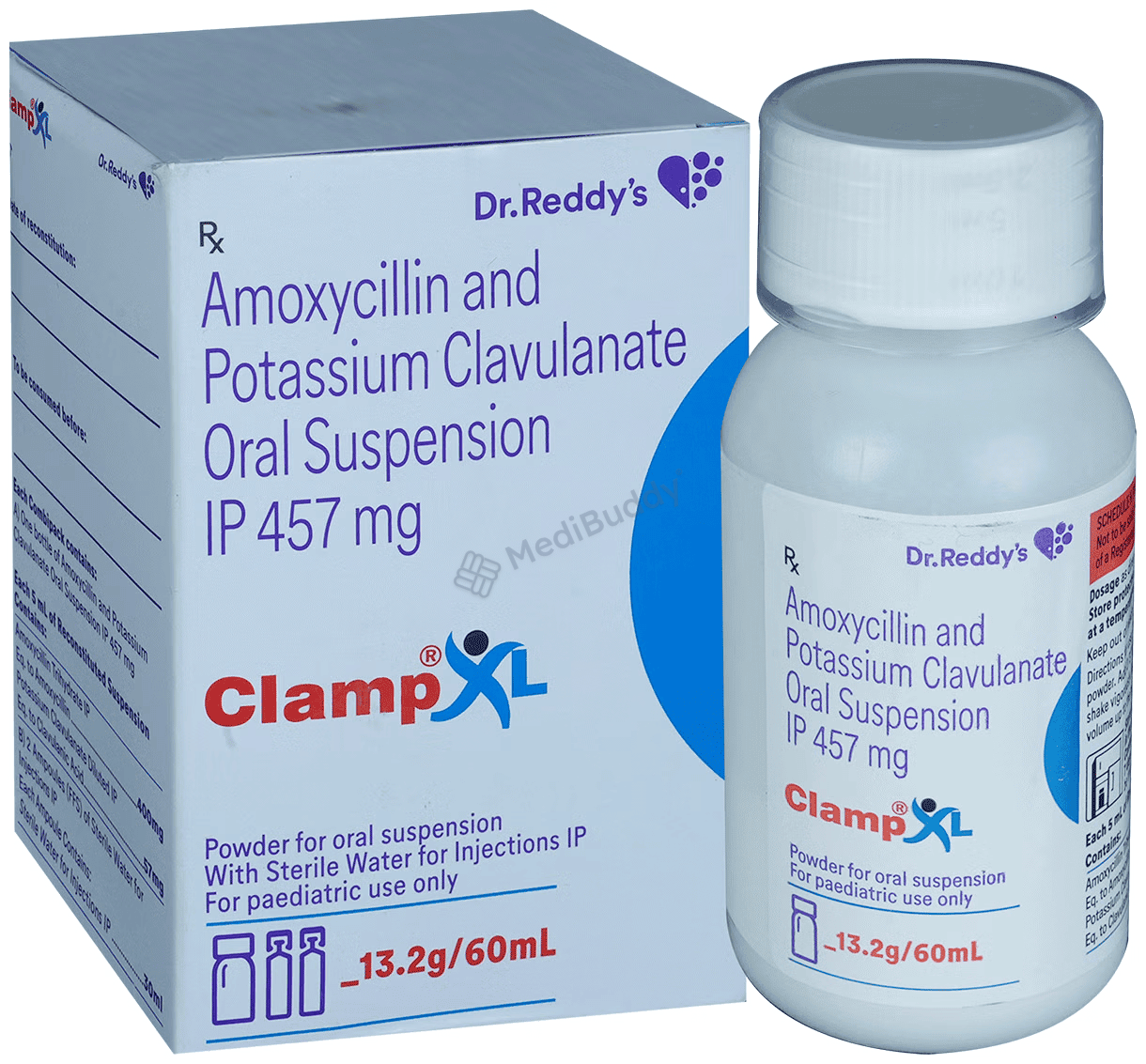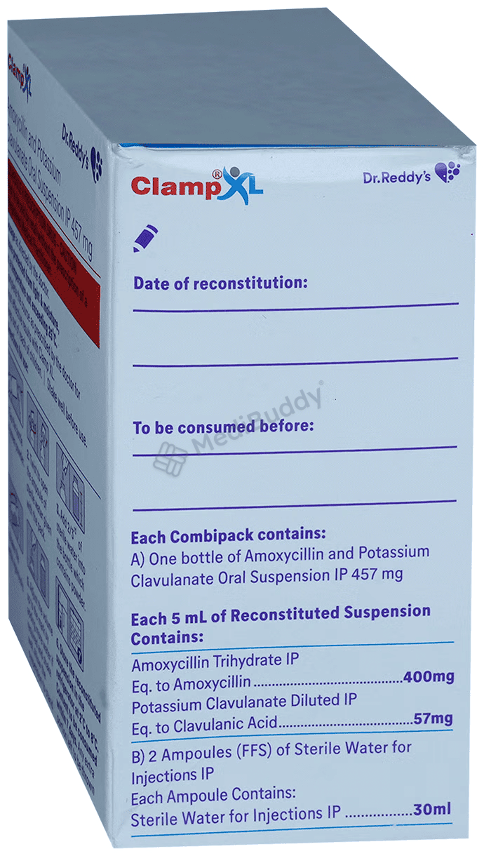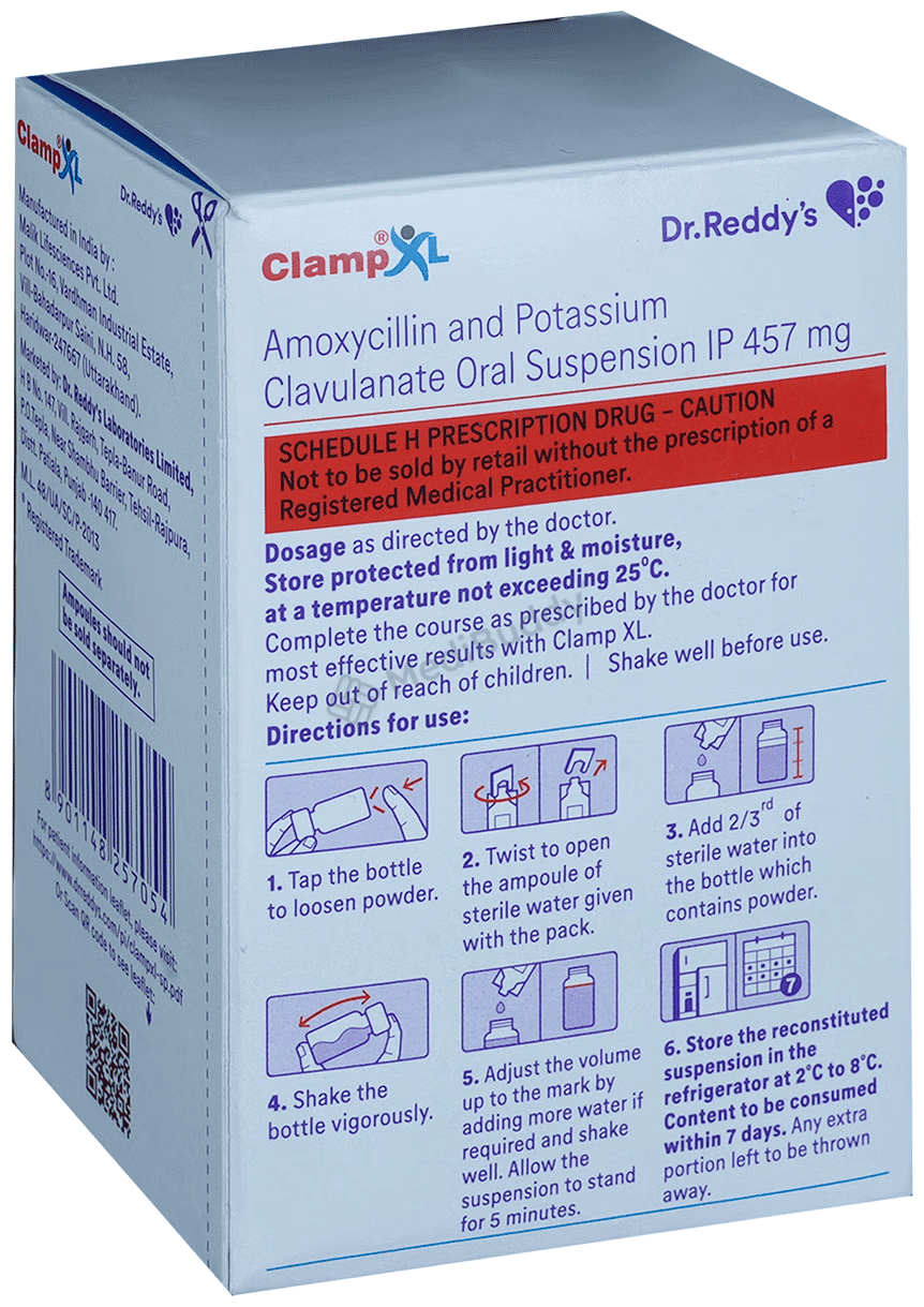 Clamp XL Oral Suspension is commonly used for treating various types of bacterial infections that can affect different parts of the body. It is effective in the treatment of resistant tuberculosis (TB) as well as bacterial infections such as middle ear and sinus infections, respiratory tract infections, genital tract infections, urinary tract infections, skin and soft tissue infections including dental infections, bone and joint infections, septic abortion (any abortion complicated by uterine infection), and abdominal infections. The dry syrup is prescribed by healthcare professionals to combat these bacterial infections and promote recovery.