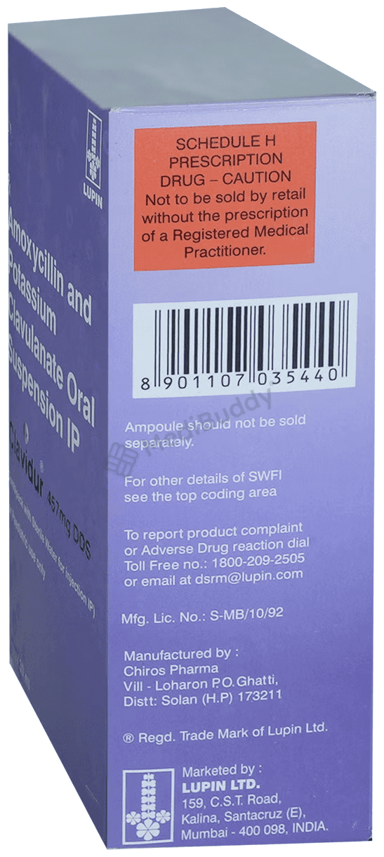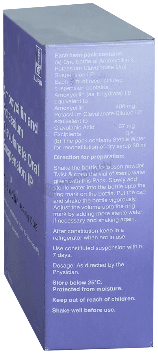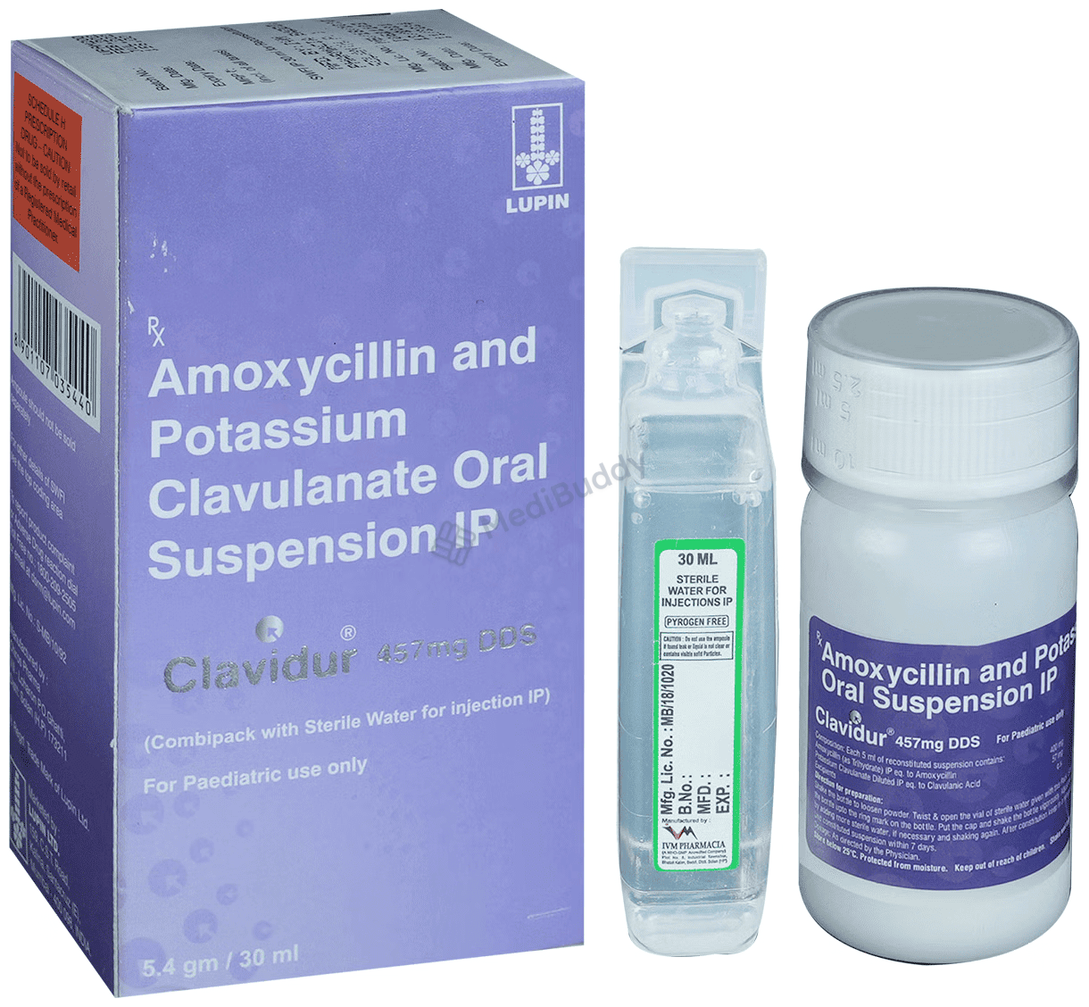 Moreover, Clavidur 457mg DDS Oral Suspension is categorized as a broad-spectrum antibiotic, exhibiting efficacy against both gram-positive and gram-negative bacteria. This broad coverage expands its utility in treating a diverse array of infections affecting various body systems, ranging from respiratory tract to soft tissues, urinary tract, and more. With a well-balanced combination of ingredients that target different aspects of bacterial infections, Clavidur 457mg DDS Oral Suspension offers a reliable and comprehensive solution for combating bacterial ailments effectively.