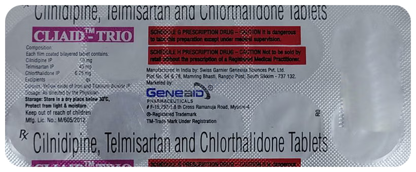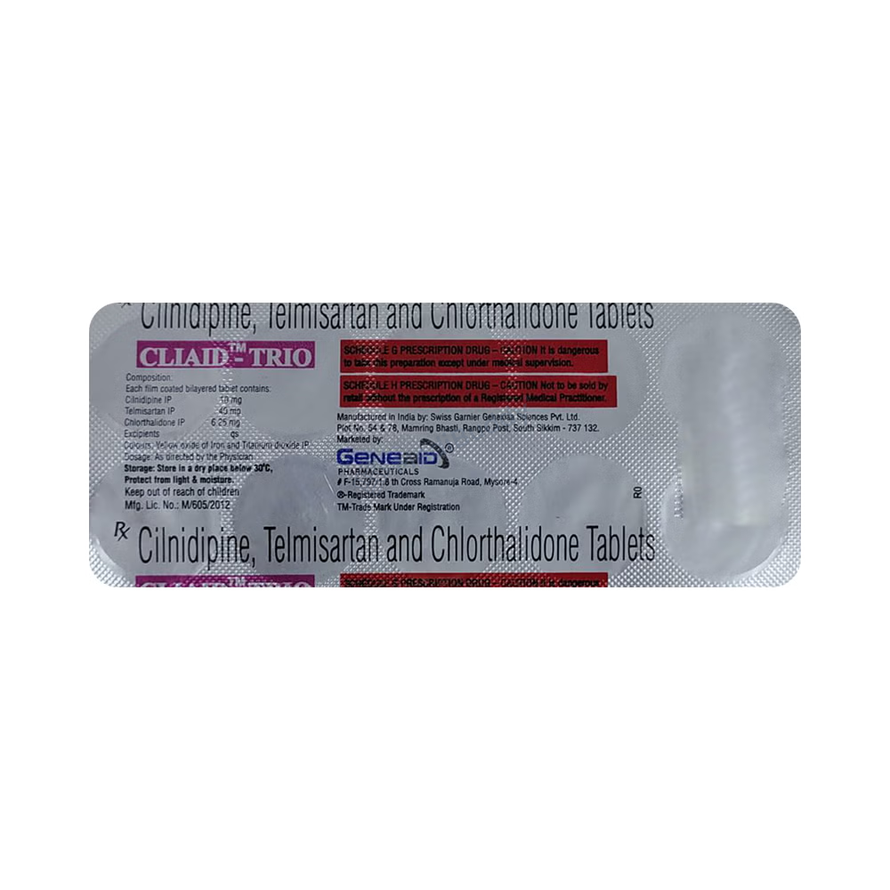 Cliaid-Trio Tablet is used to treat hypertension (high blood pressure) by relaxing blood vessels, optimizing blood flow, and eliminating excess water from the body. This medicine reduces the risk of heart attacks, strokes, and kidney issues associated with high blood pressure. It is important to take Cliaid-Trio Tablet as directed by your physician to maintain its effectiveness, even if you are not experiencing any immediate benefits. Regular monitoring and adherence to treatment are crucial as high blood pressure often shows no symptoms, and discontinuing treatment may elevate the risk of severe cardiovascular events.