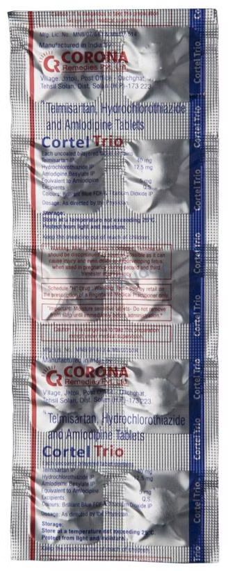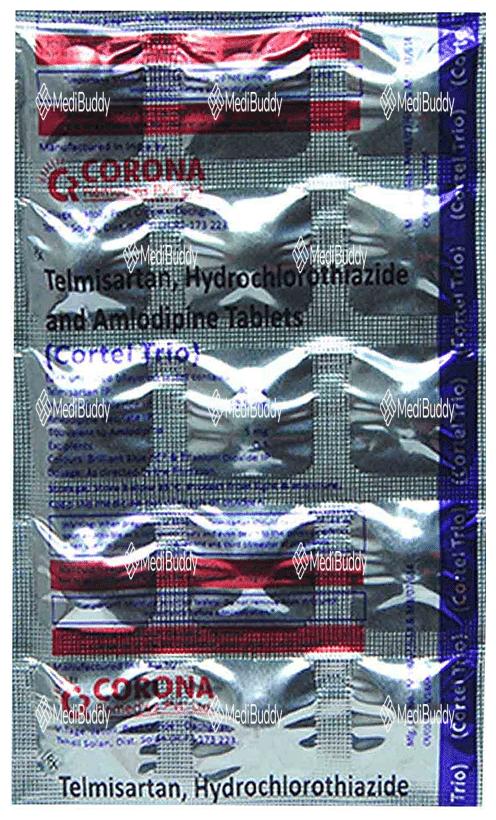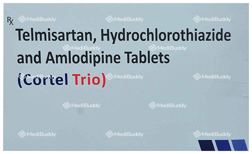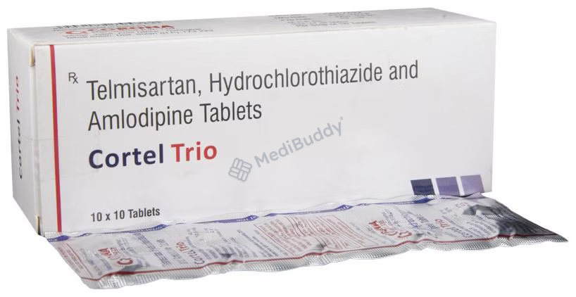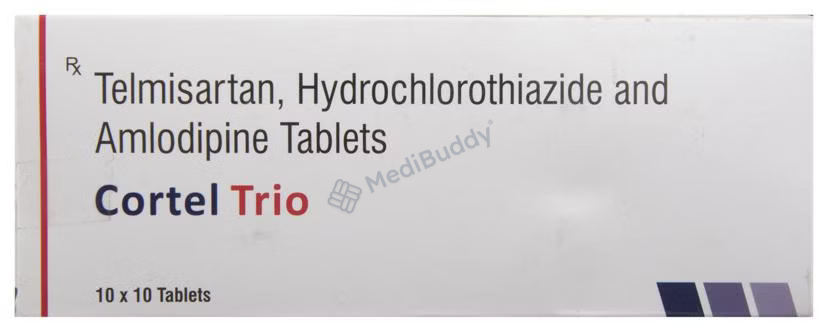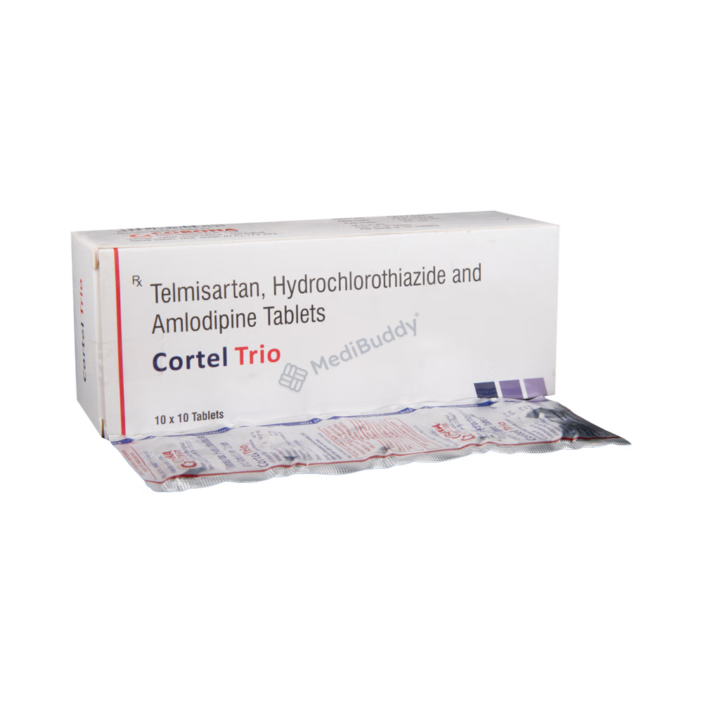 Cortel Trio Tablet 10's is a medication used to treat hypertension, also known as high blood pressure. This condition occurs when the force of blood against the artery walls is elevated, potentially leading to heart diseases and other complications. Cortel Trio Tablet 10's is a combination of three active ingredients: Telmisartan, Amlodipine, and Hydrochlorothiazide. Telmisartan, an angiotensin receptor blocker, helps in relaxing blood vessels, allowing for smoother blood flow and improved heart efficiency. Amlodipine, a calcium channel blocker, works by widening blood vessels. Hydrochlorothiazide, a diuretic, aids in removing excess water and electrolytes through urine.