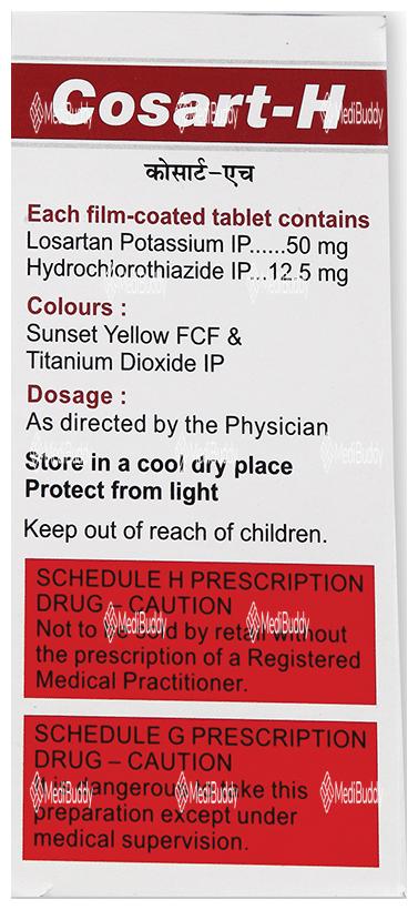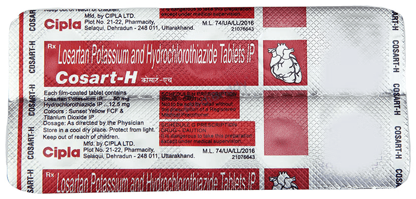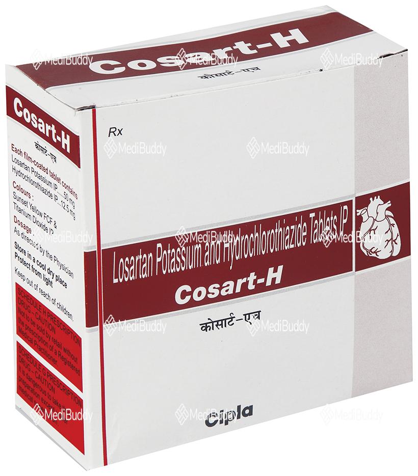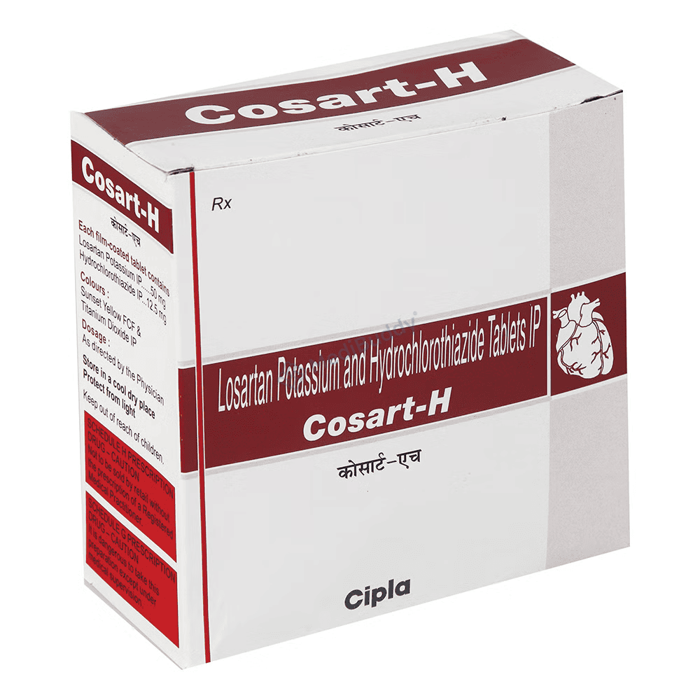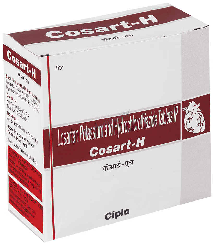 Cosart-H Tablet is used to treat high blood pressure, or hypertension, which is a condition where the force of blood against the artery walls is too high. If left untreated, high blood pressure can lead to serious health issues like heart attacks, strokes, and kidney problems. This medication contains two components, Losartan and Hydrochlorothiazide, which work together to help control blood pressure. Losartan relaxes and widens blood vessels, while Hydrochlorothiazide acts as a diuretic, increasing urine output to reduce blood pressure. It's important to take this medication regularly as prescribed to effectively manage hypertension and reduce the risk of complications.
