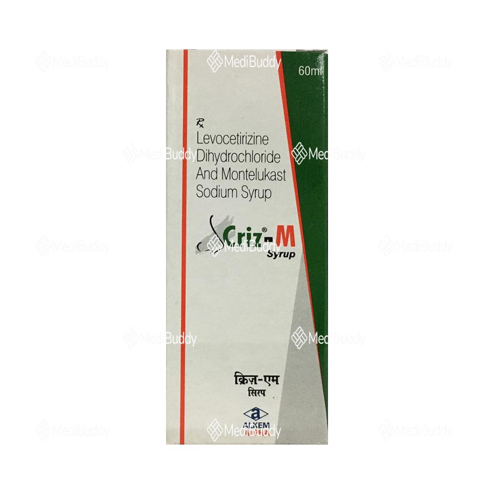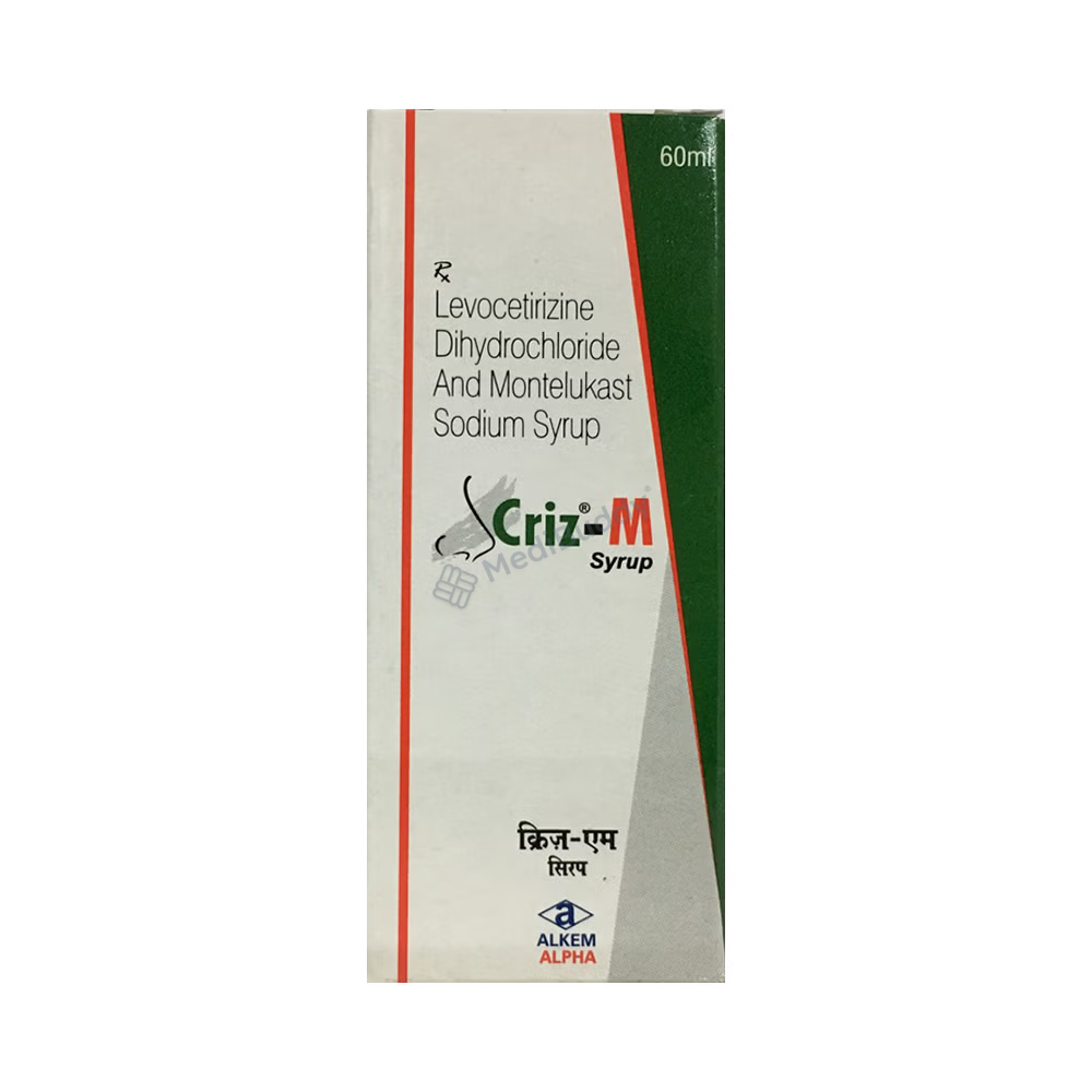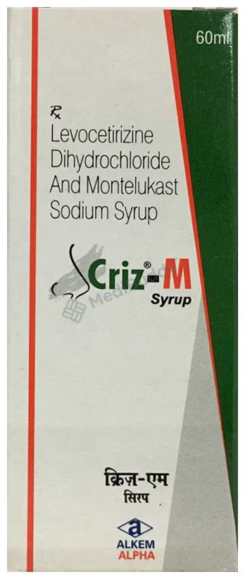 Criz M Syrup is an antihistamine and antiallergic medication used to provide relief from various allergic reactions typical in children, such as cold symptoms, runny nose, and sneezing. It contains Montelukast and Levocetirizine. Montelukast works as a leukotriene antagonist, reducing inflammation and swelling in the nose by blocking the chemical messenger leukotriene. On the other hand, Levocetirizine acts by blocking histamine, a chemical messenger involved in allergic reactions. Together, these components help alleviate discomfort and symptoms associated with allergies, like nasal congestion and red, watery eyes.