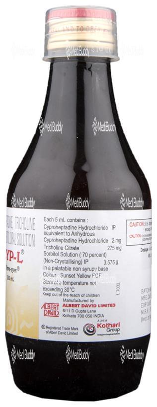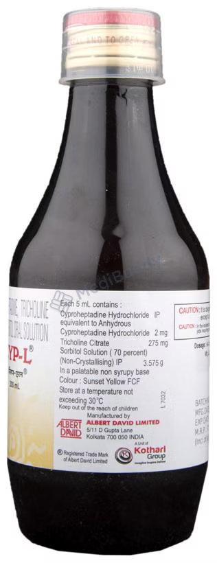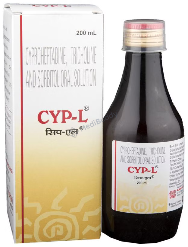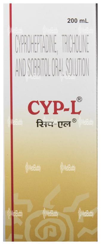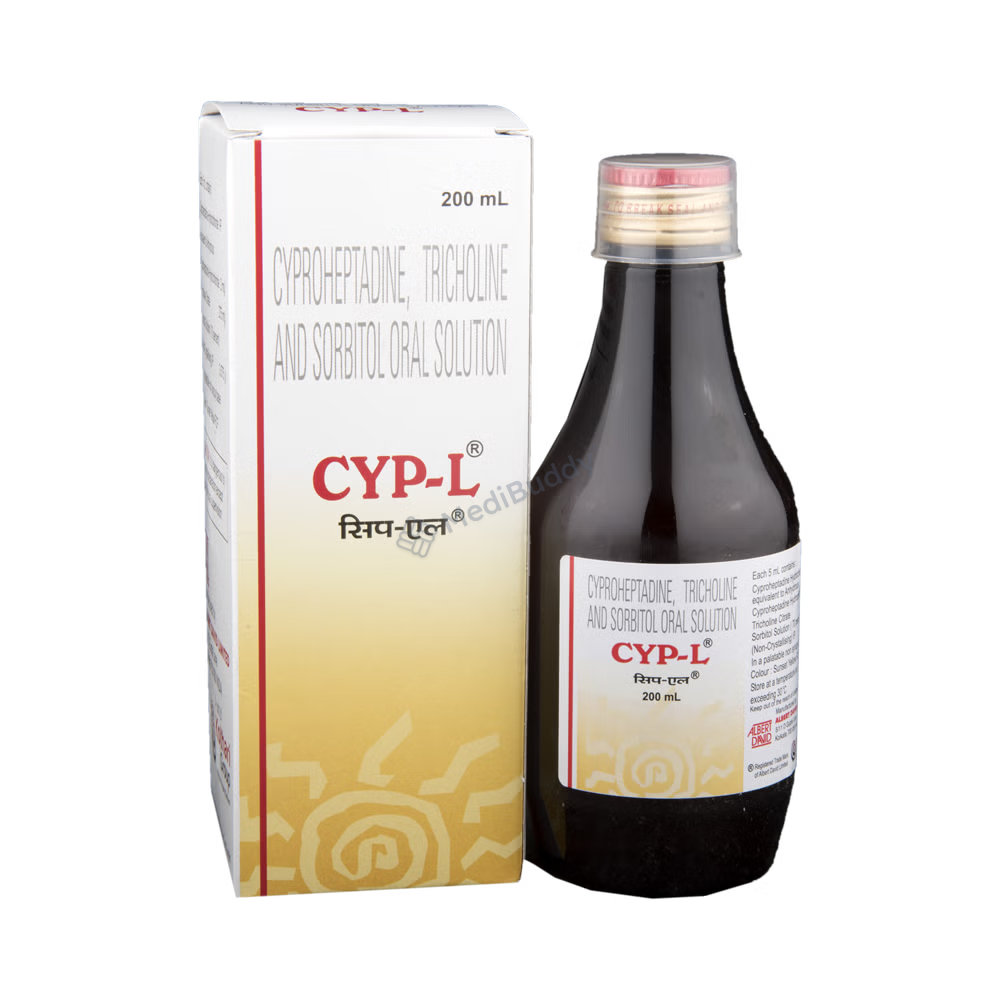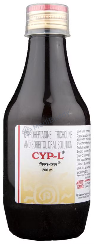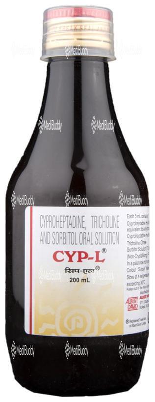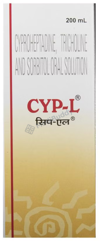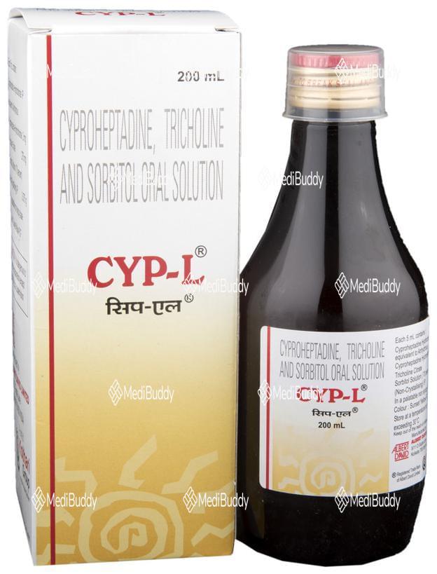 CYP-L Oral Solution is used as an appetite stimulant to treat loss of appetite. It works by reducing the effect of a chemical messenger that regulates appetite. This medicine increases hunger by promoting the desire to eat, making it effective in managing undernutrition or malnutrition. It is safe and helps improve the nutritional status of individuals. Follow your doctor's advice on dosage and duration of treatment. Inform your healthcare team about all medications you are taking. Common side effects include constipation, dry mouth, blurred vision, drowsiness, and sleepiness. Contact your doctor if you have concerns. Avoid alcohol consumption while using this medicine. Prior medical consultation is necessary for individuals with kidney or liver diseases, and pregnant or breastfeeding women should consult their doctor before use.