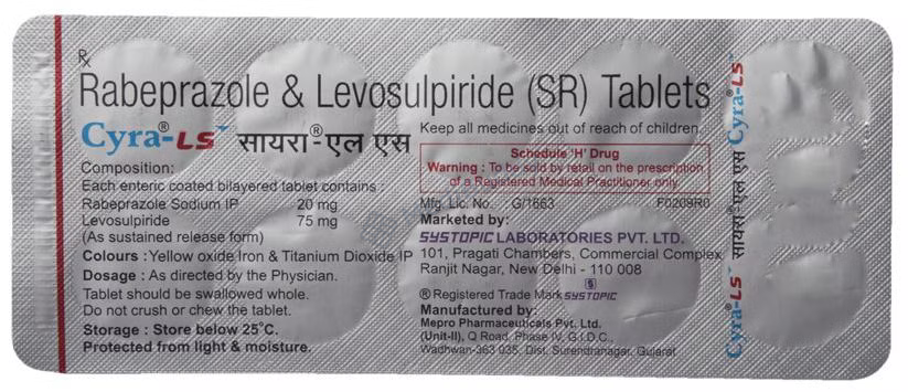 CYRA LS TABLET is a blend of Levosulpiride and Rabeprazole, catered to treat conditions such as Gastro-esophogeal reflux disease (GERD), peptic ulcers, Zollinger-Ellison syndrome, and functional dyspepsia. This medication is recommended to be taken on an empty stomach and alcohol consumption should be avoided while using it to avert any adverse effects. Patients on extended treatment with CYRA LS TABLET need to be closely monitored for bone fracture risks, particularly individuals with osteoporosis or those on corticosteroids.