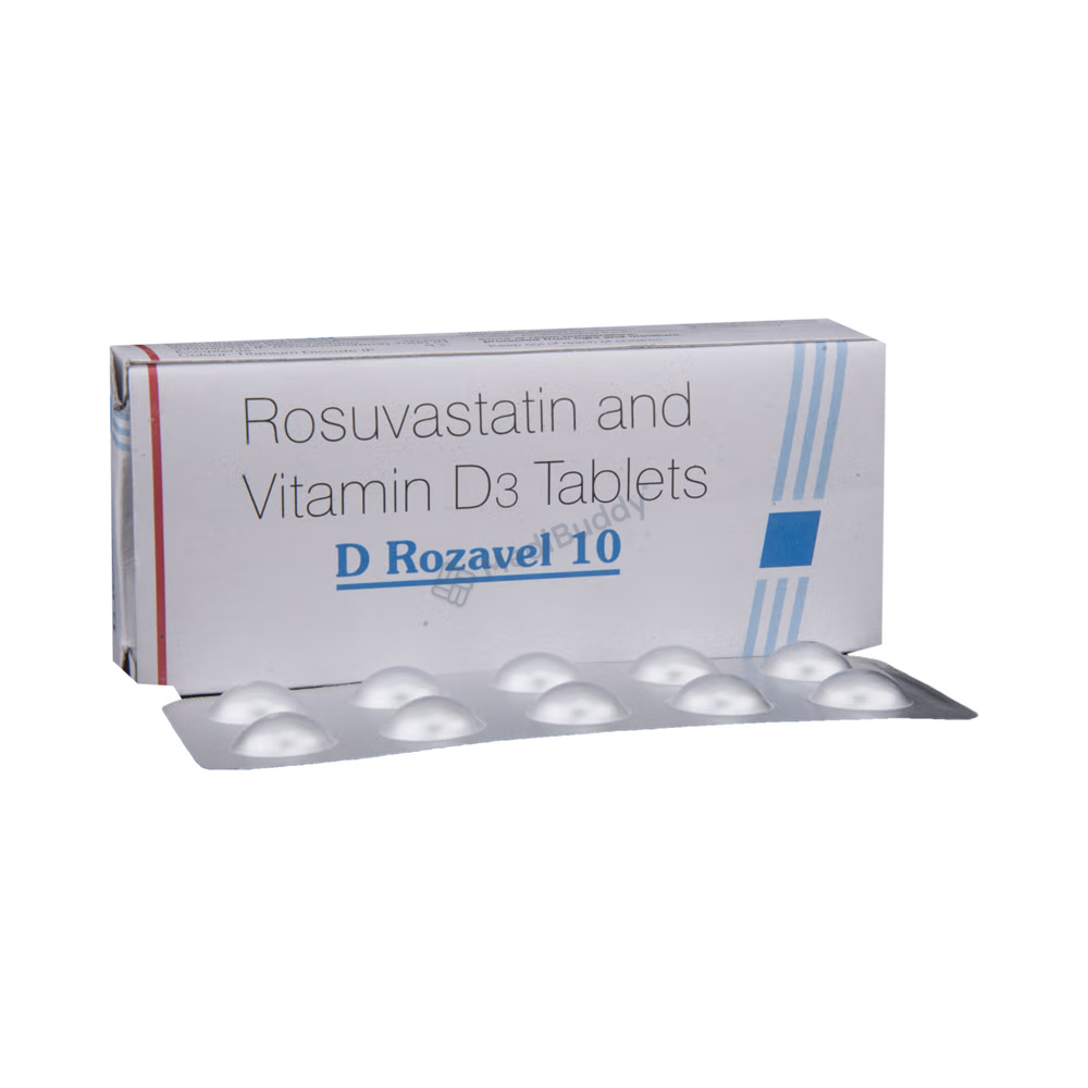 D Rozavel 10 Tablet is a medication used to treat high cholesterol levels in the body. High cholesterol, also known as hyperlipidemia or dyslipidemia, can lead to serious heart conditions like heart attacks and strokes. This medication works by reducing the levels of "bad" cholesterol (LDL) and triglycerides in the body. By lowering cholesterol levels, it helps reduce the risk of future heart attacks and strokes.