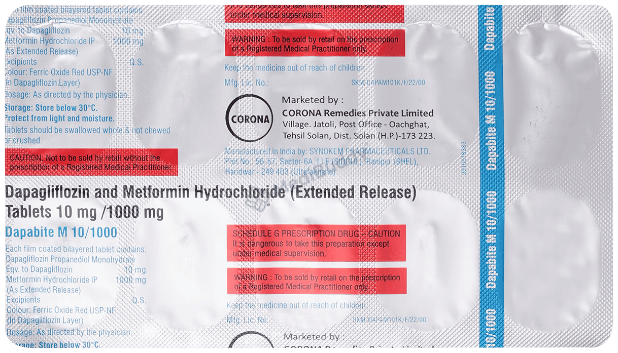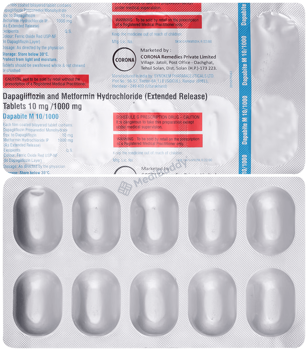 Dapabite M 10mg/1000mg Tablet is a combination medication containing two active ingredients: Dapagliflozin and Metformin. It falls under the category of Antidiabetic drugs and is primarily prescribed for the management of type 2 diabetes mellitus. When traditional diabetes treatments prove ineffective, Dapabite M 10mg/1000mg Tablet comes into play to help control high blood sugar levels associated with diabetes, thereby reducing the risk of severe diabetes-related complications and preventing heart disease.