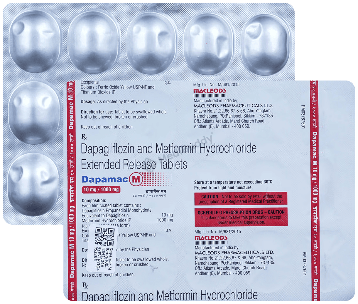 It is important to take Dapamac M 10mg/1000mg Tablet as directed by your healthcare provider. The dosage will be determined by your doctor, and it is recommended to take it at the same time every day to help establish a routine. Do not discontinue the medication without consulting your doctor, as abrupt cessation may lead to an increase in blood sugar levels, putting you at risk of severe complications like kidney damage and vision impairment. This medication is just one component of a comprehensive treatment plan that should also include a balanced diet, regular physical activity, and weight management, as advised by your healthcare provider.