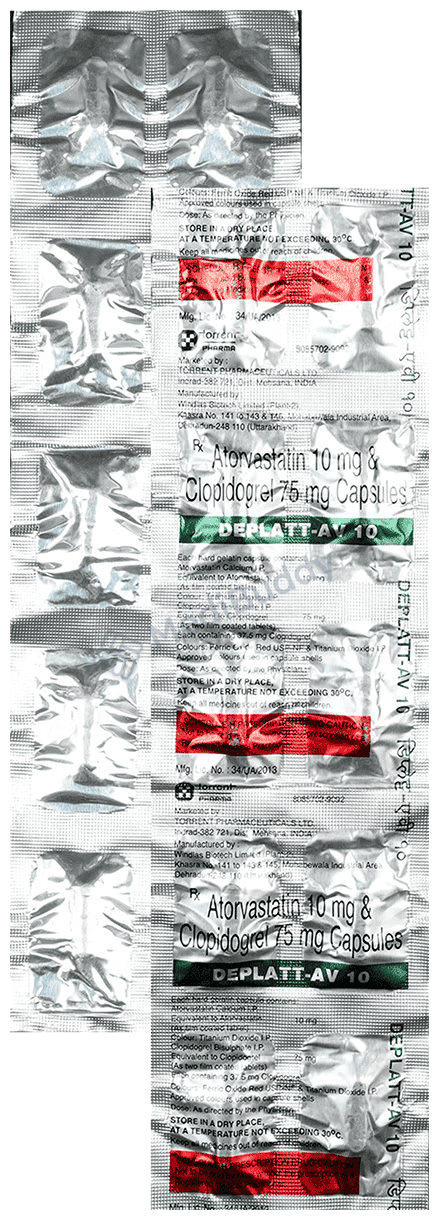 Deplatt-AV 10 Capsule is a combination medication designed to lower the risk of heart attack and stroke by reducing levels of "bad" cholesterol (LDL) and triglycerides in the body, as well as inhibiting the formation of blood clots. This capsule contains two key ingredients: Atorvastatin, which works to decrease cholesterol production in the body, and Clopidogrel, which acts as a blood thinner to prevent clot formation in the blood vessels.