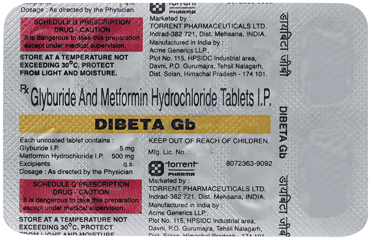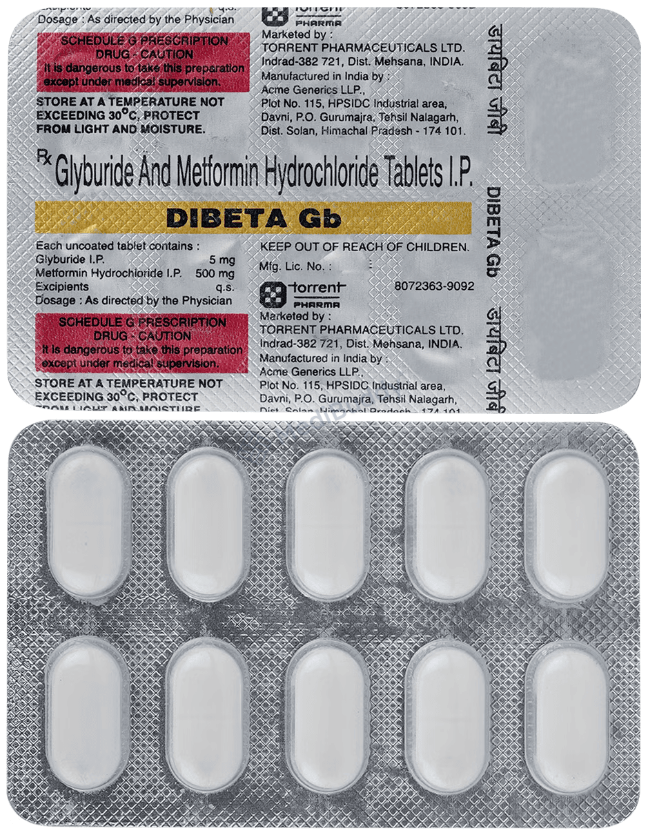 Dibeta GB 5 mg/500 mg Tablet, containing Metformin and Glibenclamide, supports individuals with type 2 diabetes by reducing sugar production in the liver, delaying sugar absorption from the intestines, and stimulating insulin production by beta cells in the pancreas to regulate blood sugar levels effectively. Adherence to the prescribed dosage is imperative, and any adverse effects experienced should be promptly discussed with your doctor. Avoid consuming Dibeta GB 5 mg/500 mg Tablet if you have allergies to any of its components, are pregnant, planning pregnancy, or are a child. Elderly patients should exercise caution while using this medication and abstain from alcohol consumption to prevent complications like lactic acidosis. Drive only when fully alert after taking Dibeta GB 5 mg/500 mg Tablet.
