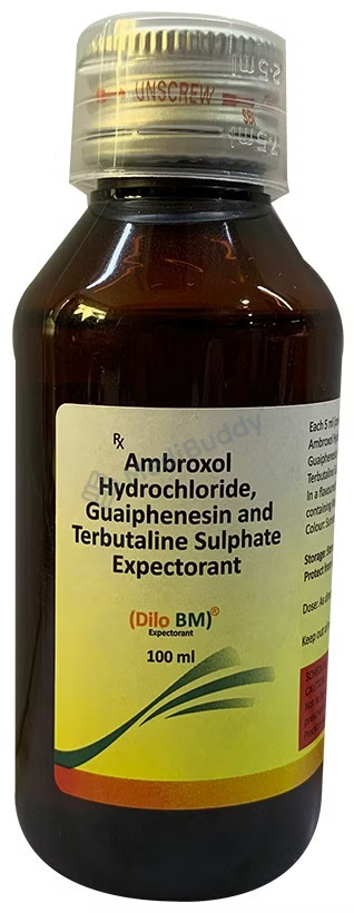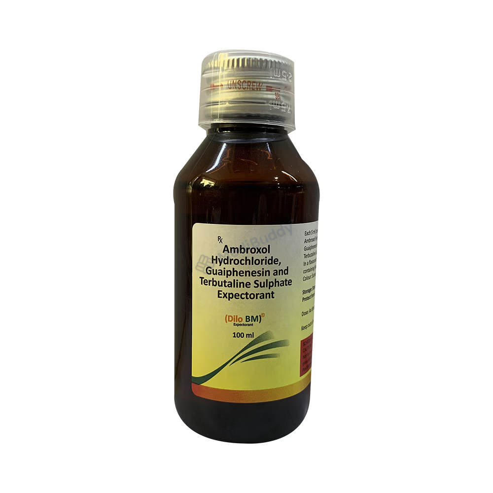Dilo BM Expectorant 100 ml contains Ambroxol, Guaiphenesin, and Terbutaline. Ambroxol assists in thinning and loosening mucus in the respiratory system, while Guaiphenesin enhances fluid volume in the airways, reduces mucus stickiness, and facilitates its clearance. Terbutaline works by relaxing muscles in the airways, aiding in easier breathing. Together, these ingredients provide relief from cough symptoms.
