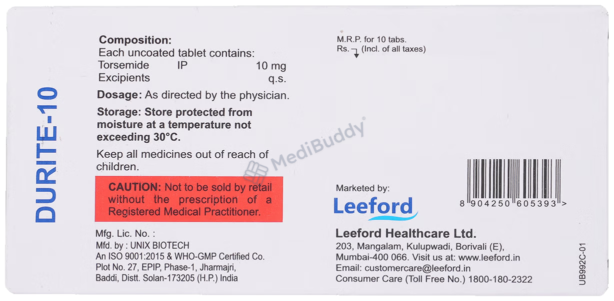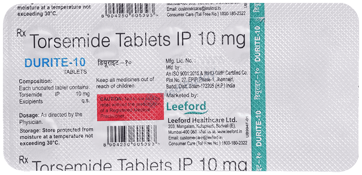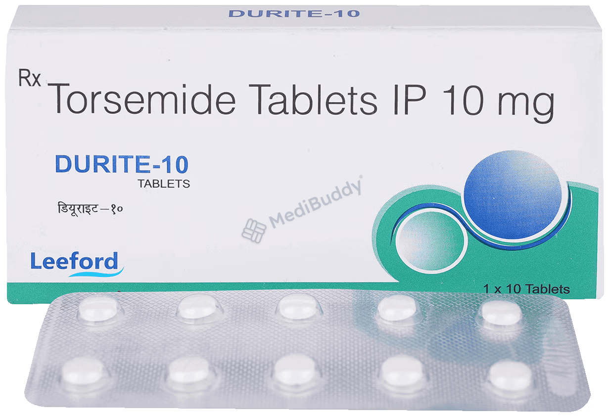 It's crucial to remember that DURITE 10 TABLET contains Torsemide, a diuretic that helps the body eliminate excess water and salt through urine. This medication is primarily used to treat edema associated with conditions like heart failure, liver disease, or kidney disease. If you experience any side effects or have any concerns while taking Durite 10mg Tablet, do not hesitate to consult your doctor.