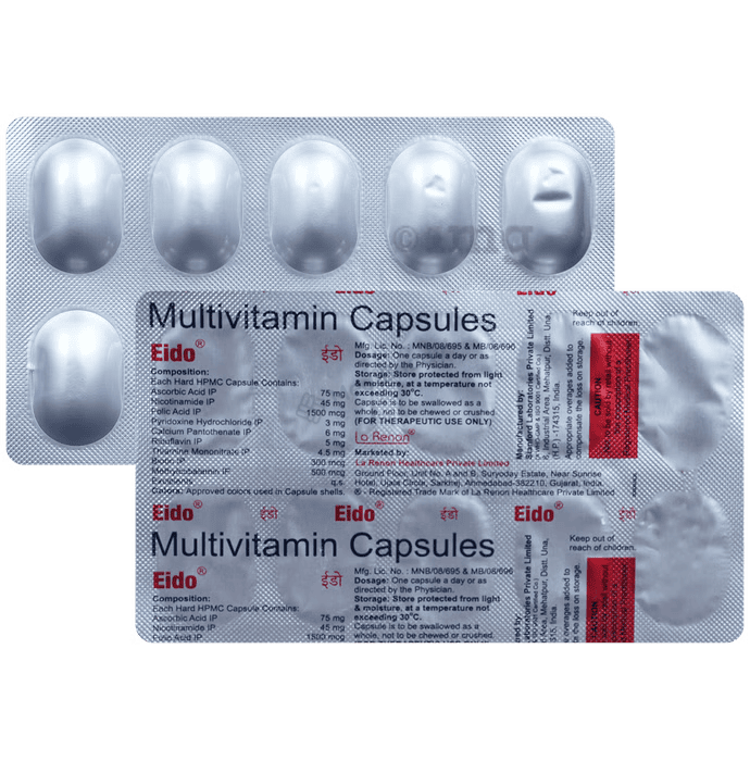 Eido Capsule is a high-quality health supplement abundant in essential vitamins and minerals crucial for maintaining optimal bodily functions. Designed to support overall well-being, this supplement is specially formulated to provide vital nutrients that contribute to bone strength, red blood cell production, and muscle recovery. With a blend of key ingredients such as Ascorbic Acid, Nicotinamide, Folic Acid, Pyridoxine Hydrochloride, Calcium Pantothenate, Riboflavin, Thiamine Mononitrate, and Biotin, Eido Capsule delivers a comprehensive health support solution.
