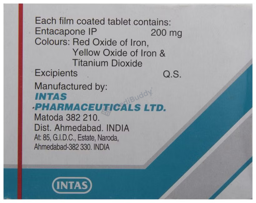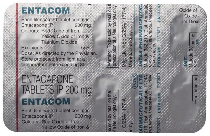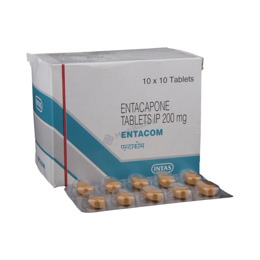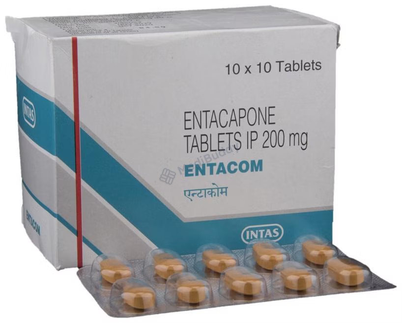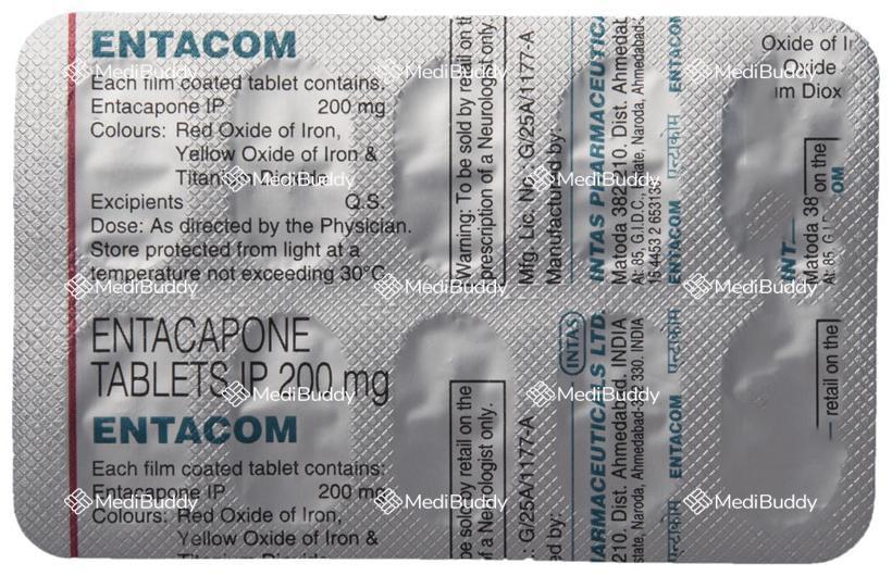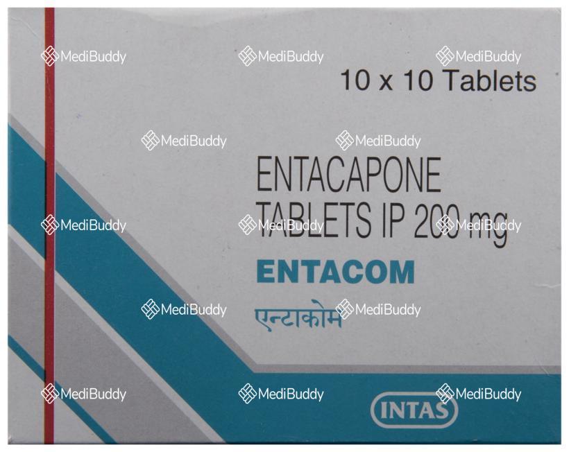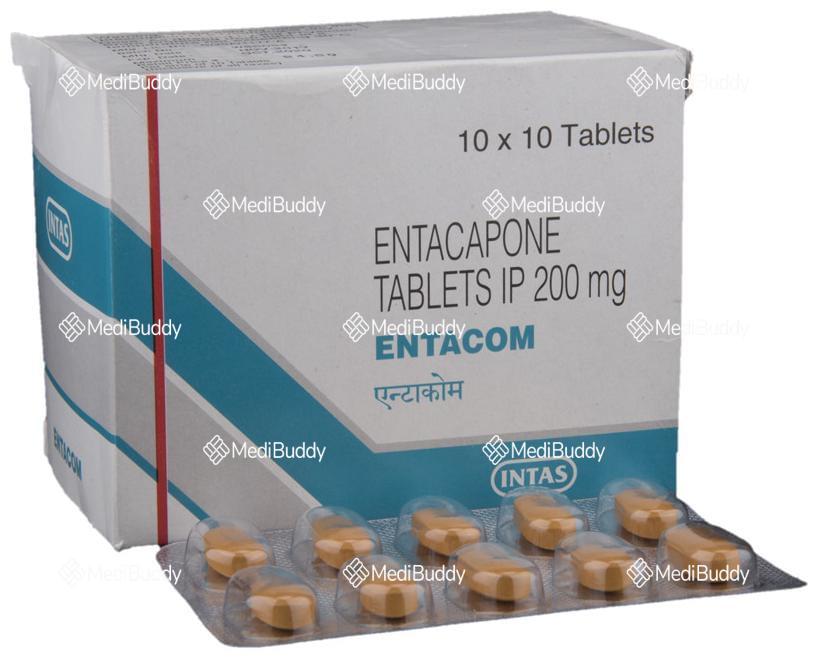 Entacom Tablet, also known as ENTACOM, is a medication primarily used in the treatment of Parkinson's disease. This tablet is specifically designed to address the wearing-off symptoms associated with Parkinson's disease, including stiffness, tremors, muscle spasms, and poor muscle control. It is usually prescribed alongside carbidopa/levodopa and can be taken with or without food, preferably at bedtime. It is important to take Entacom Tablet at the same time each day to maintain a consistent level of the medicine in the body, as advised by your healthcare provider.