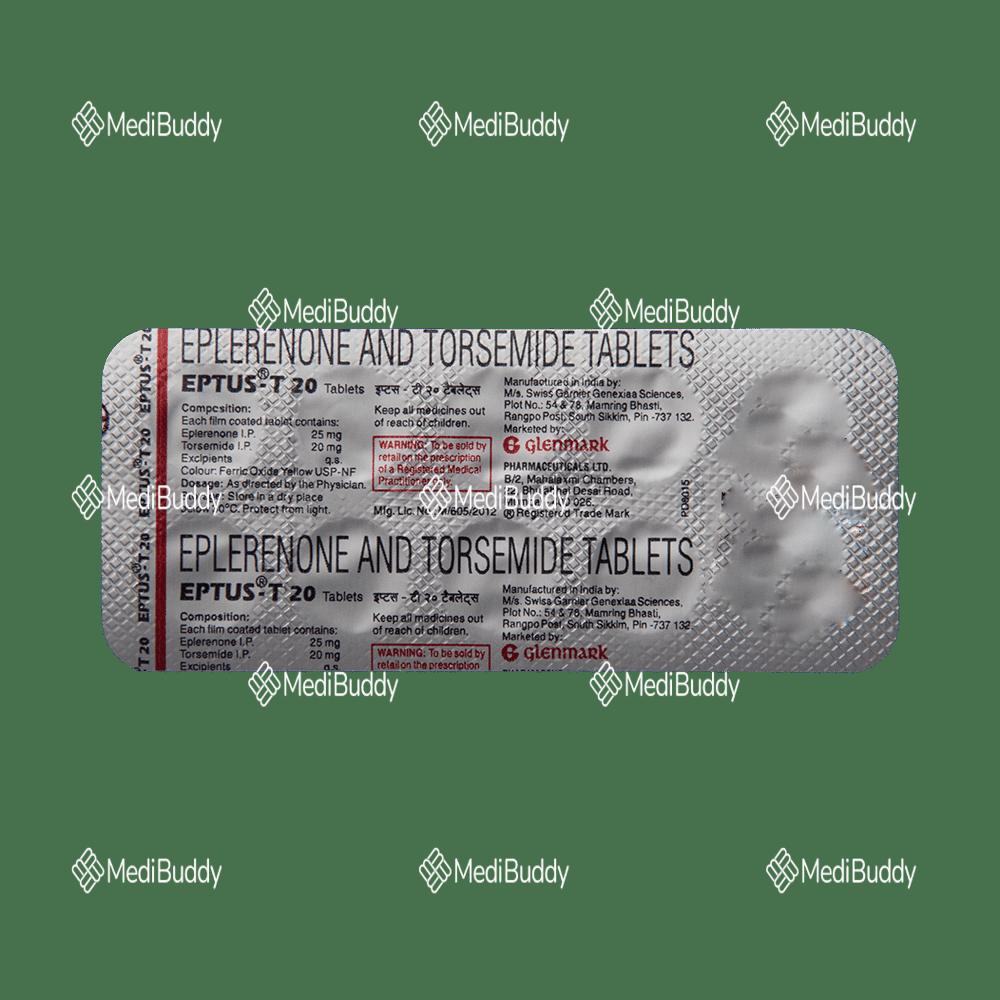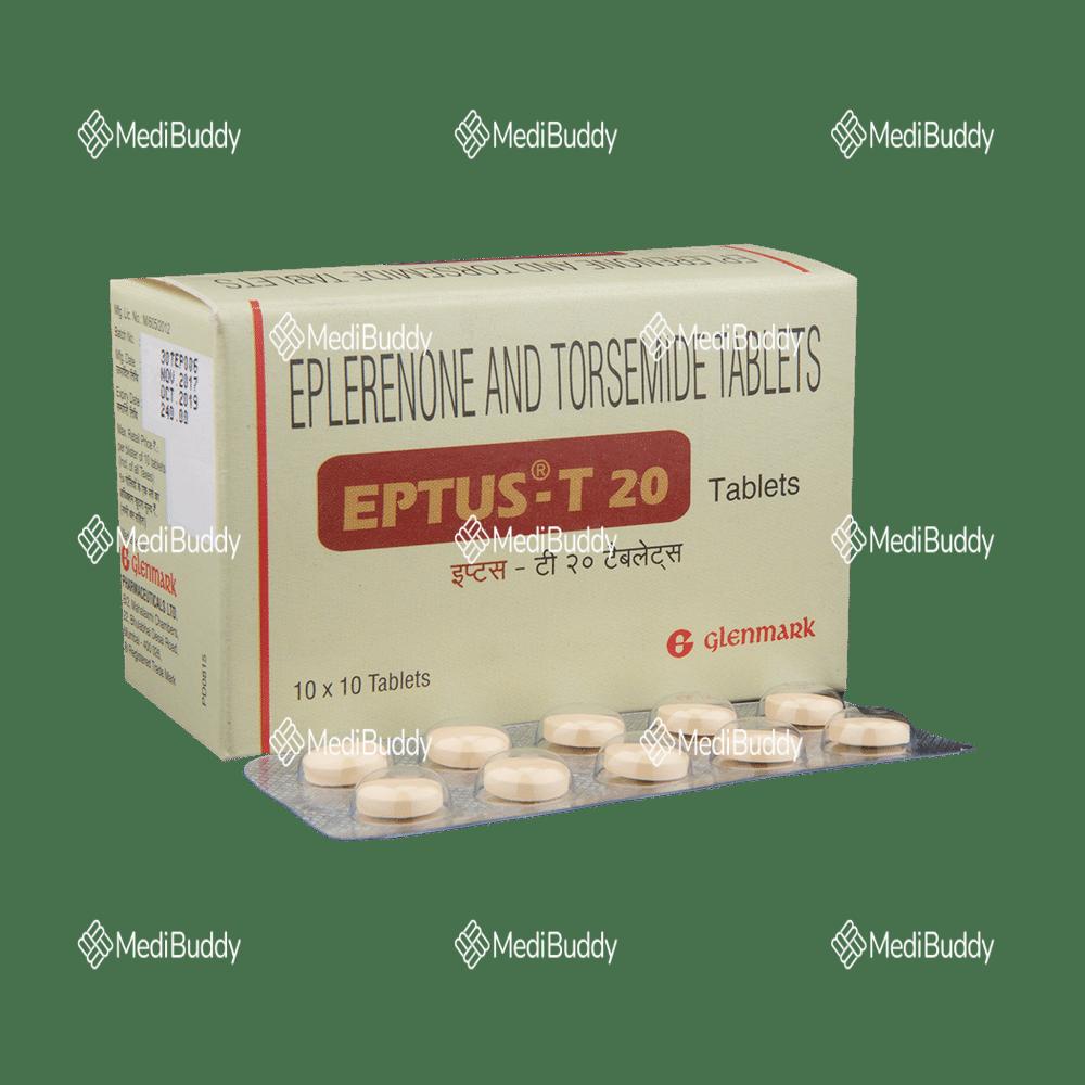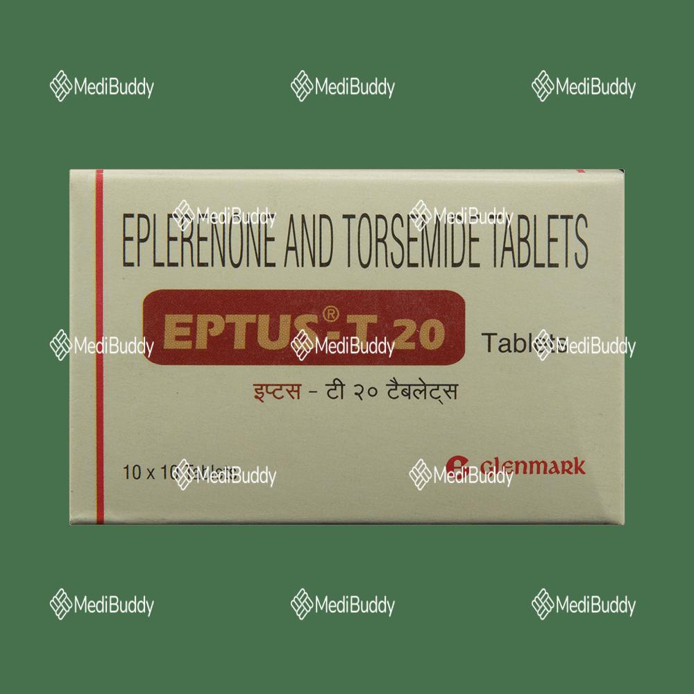 Eptus-T 20 Tablet is a medication used to treat congestive heart failure post-myocardial infarction (heart attack) and hypertension. It is a combination of two medicines - Eplerenone and Torsemide. Eptus-T 20 Tablet belongs to a class of medicines called diuretics, also known as water pills, which work by removing excess water from the body. This helps reduce fluid levels in the body, relieving conditions such as oedema (fluid retention) associated with pulmonary hypertension, heart failure, and hepatic cirrhosis.