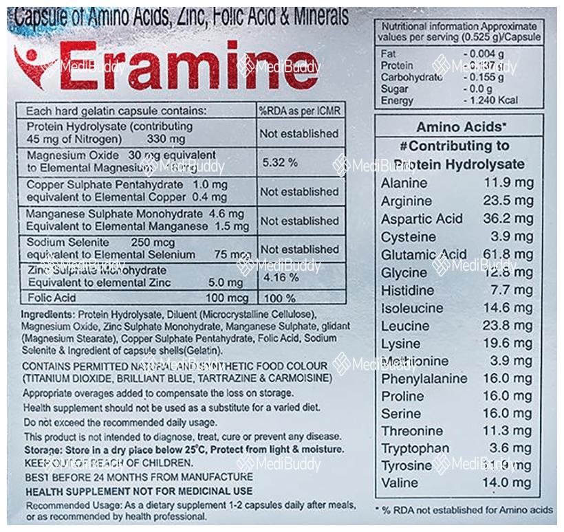 Eramine Capsule is a dietary supplement that has been traditionally used to address vitamin deficiencies in the body. This supplement is formulated with essential vitamins and minerals like copper sulfate, folic acid, Vitamin B6, Thiamine, and Zinc Sulfate, all of which play a crucial role in maintaining overall health and supporting the proper functioning of vital organs.