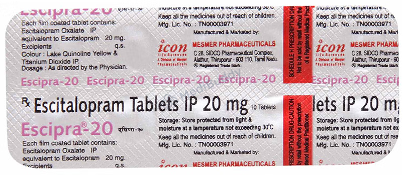 Escipra 20 Tablet, also known as Escipra-20 Tablet, is a widely prescribed type of antidepressant that falls under the category of selective serotonin reuptake inhibitors (SSRI). It is commonly used to address conditions such as depression, anxiety, panic disorder, and obsessive-compulsive disorder. Depression is a mood disorder characterized by feelings of sadness and loss, while anxiety brings about tension and worried thoughts, and panic disorder entails sudden bouts of terror. Obsessive-compulsive disorder involves repetitive thoughts or actions.
