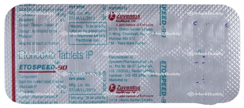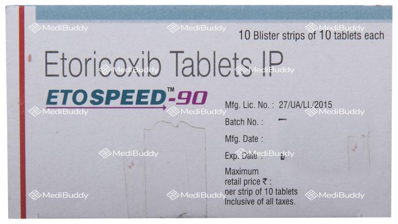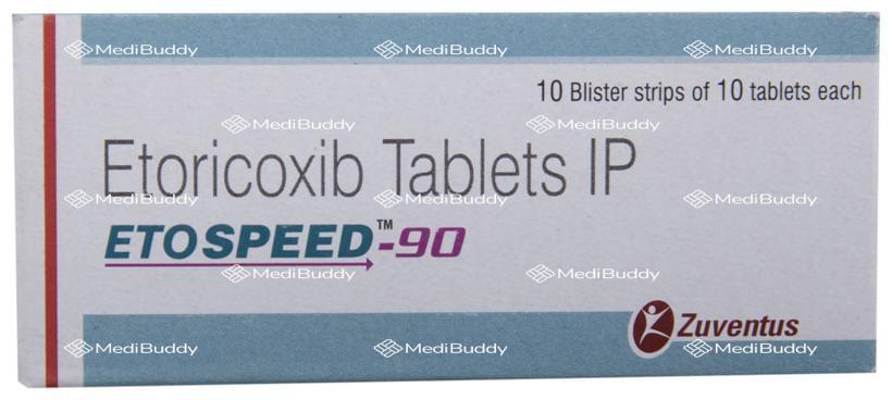Etospeed 90 Tablet 10's, containing 'etoricoxib', belongs to the group of medications known as non-steroidal anti-inflammatory drugs (NSAIDs), used to treat pain, swelling, and inflammation in conditions such as osteoarthritis, rheumatoid arthritis, ankylosing spondylitis, and gout in individuals over 16 years of age. It can also be used for moderate pain after dental surgery. Osteoarthritis, rheumatoid arthritis, ankylosing spondylitis, and gout are conditions that involve joint pain, inflammation, and degeneration.
