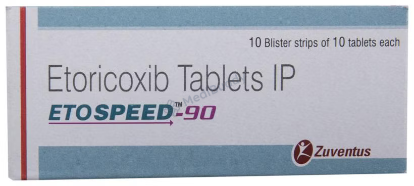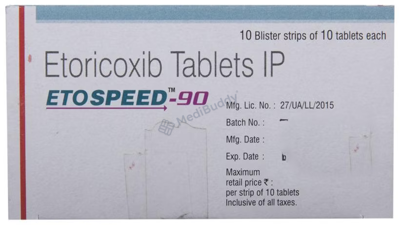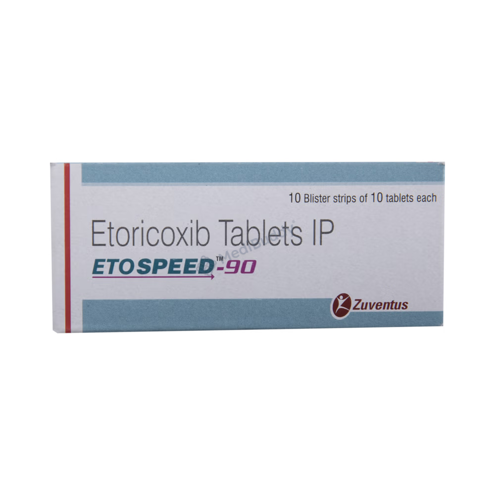 ETOSPEED 90MG TABLET, containing Etoricoxib, is a Non-Steroidal Anti-Inflammatory Drug used to reduce pain and swelling in conditions like osteoarthritis, rheumatoid arthritis, ankylosing spondylitis, and gout. It can also be used for pain relief following dental surgery in adults and adolescents over 16 years. Precautions should be taken in patients with heart, liver, or kidney issues, as well as those with diabetes, high blood pressure, or dehydration.