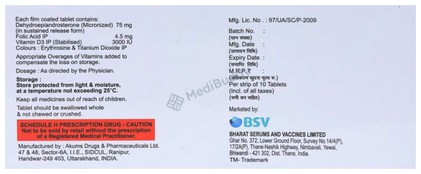 Dehydroepiandrosterone (Micronized)(75mg) + Folic Acid(4.5mg) + Vitamin D3(3000IU)