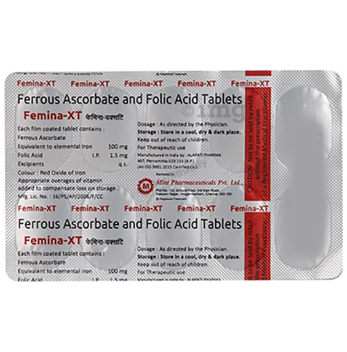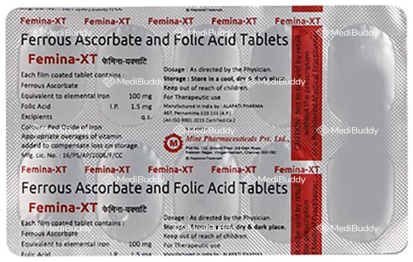 Femina XT Tablet is a medication that contains Ferrous Ascorbate (Iron) and Folic Acid (vitamin B9). These components play vital roles in the body's functions, such as nucleotide biosynthesis and maintaining red blood cells. Folic acid is crucial during periods of rapid cell division and growth, while iron helps transport oxygen throughout the body, keeping red blood cells healthy to prevent anemia.