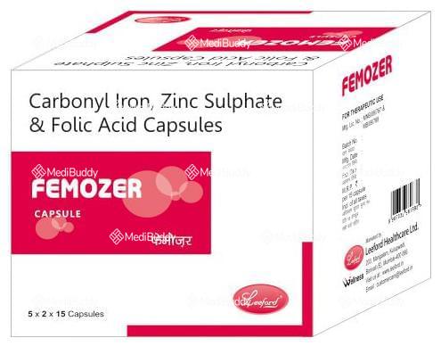 Carbonyl iron, zinc sulfate, and folic acid are the key ingredients found in Femozer Capsule. These ingredients work in harmony to promote overall heart health and general well-being. Zinc sulfate, a component known for its role in enhancing metabolism and reducing oxidative stress, contributes greatly to the effectiveness of Femozer Capsule. Folic acid, on the other hand, is essential for cell regeneration and renewal, helping to maintain the body's cellular health.