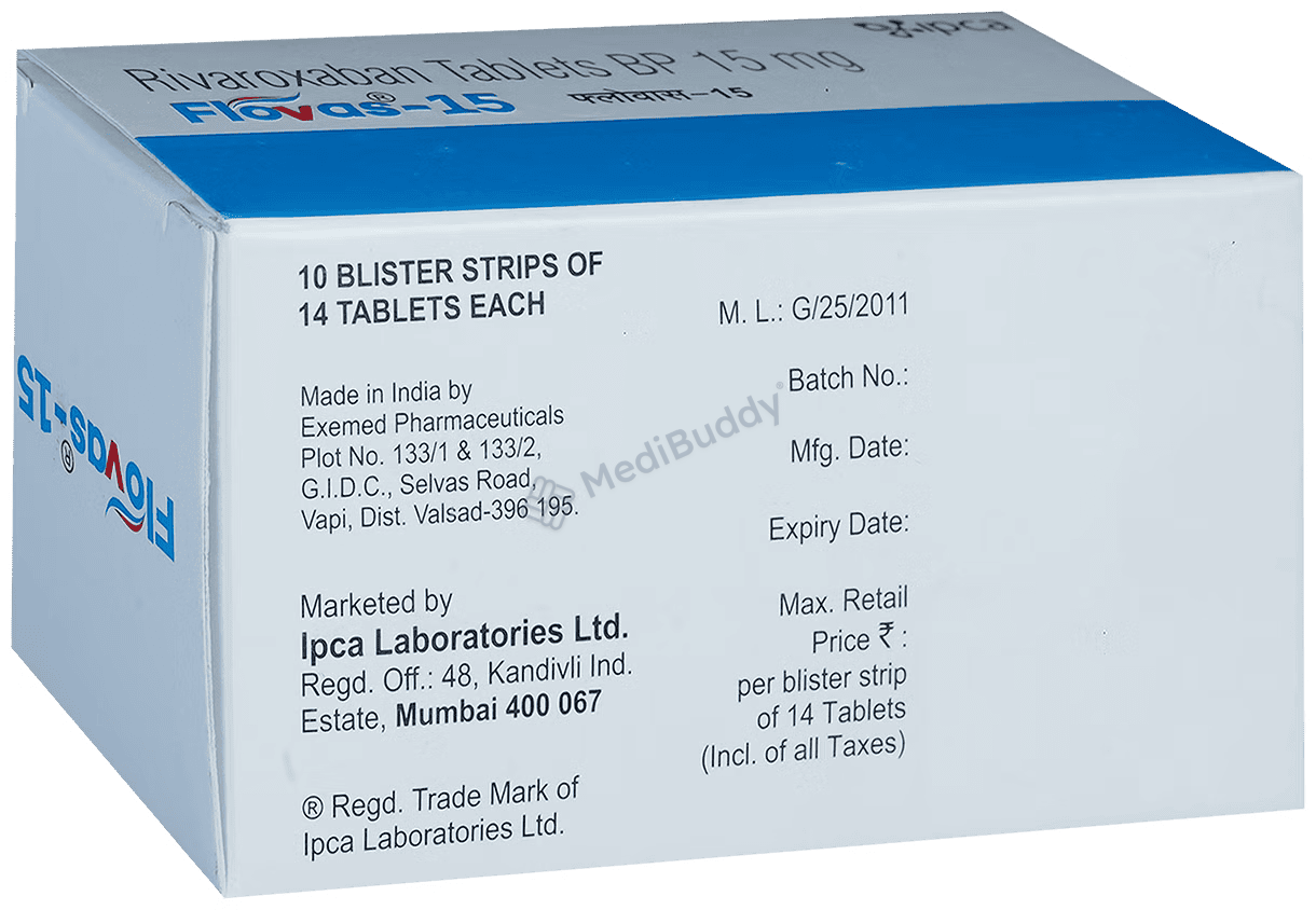 Flovas 15mg Tablet is commonly used to treat deep vein thrombosis, which is when blood clots form in the deep veins of the legs. This condition can cause symptoms like leg pain and swelling. Additionally, Flovas 15mg Tablet is used for pulmonary embolism, a condition where blood clots break free and travel to the lungs, often originating from the legs or other body parts. Symptoms of pulmonary embolism may include cough, chest pain, and shortness of breath.