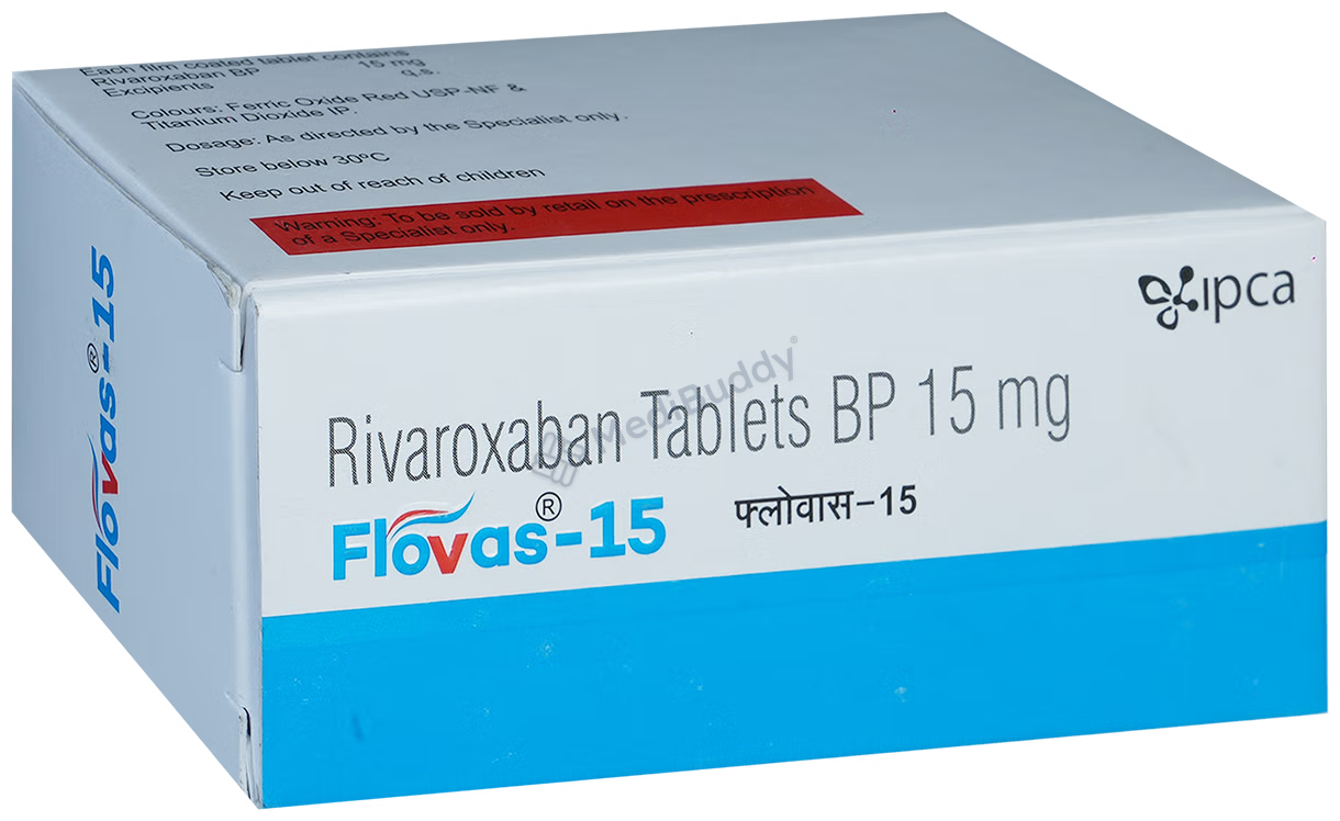 Flovas 15mg Tablet is used for the treatment and prevention of blood clots. It is primarily effective in preventing blood clots and treating conditions such as deep vein thrombosis (DVT), pulmonary embolism (PE), and venous thromboembolism (VTE). Additionally, Flovas 15mg Tablet is useful in reducing the risk of stroke, systemic embolism in nonvalvular atrial fibrillation, recurrence of DVT or PE, major cardiovascular events in patients with coronary artery disease (CAD), and major thrombotic vascular conditions in patients with peripheral artery disease (PAD). This medication can also help prevent DVT in patients who have undergone knee or hip replacement surgery, VTE in acutely ill medical patients, and thrombosis in children aged 2 years and older with congenital heart disease post the Fontan procedure.
