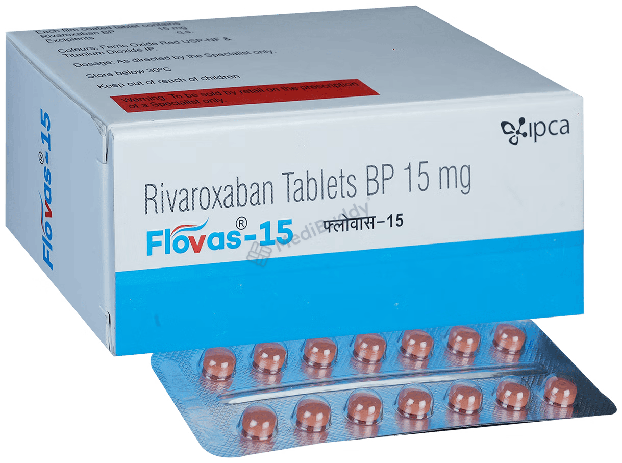 Flovas 15mg Tablet is a medication classified as an anticoagulant or blood thinner. It is commonly used to prevent and treat blood clots in various parts of the body, such as the veins of the legs, lungs, brain, and heart. Individuals with irregular heart rhythms or those who have recently undergone knee or hip replacement surgeries often benefit from taking Flovas 15mg Tablet to reduce the risk of clot formation. This medicine can be taken with or without food, but it is important to take it at the same time daily for optimal results. In some cases, patients may need to take Flovas 15mg Tablet for an extended period, possibly even for life. It is crucial not to alter the dosage or discontinue the medication without consulting a healthcare provider, as this could increase the risk of serious complications like heart attacks, strokes, or thrombosis.