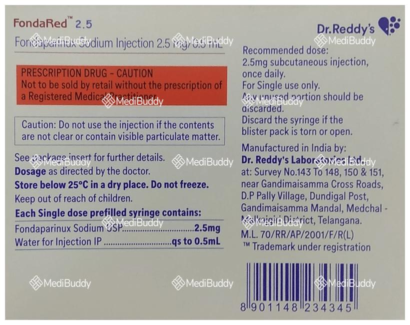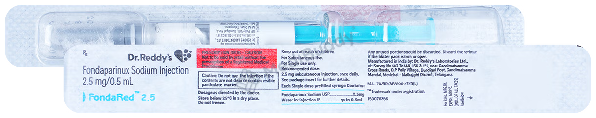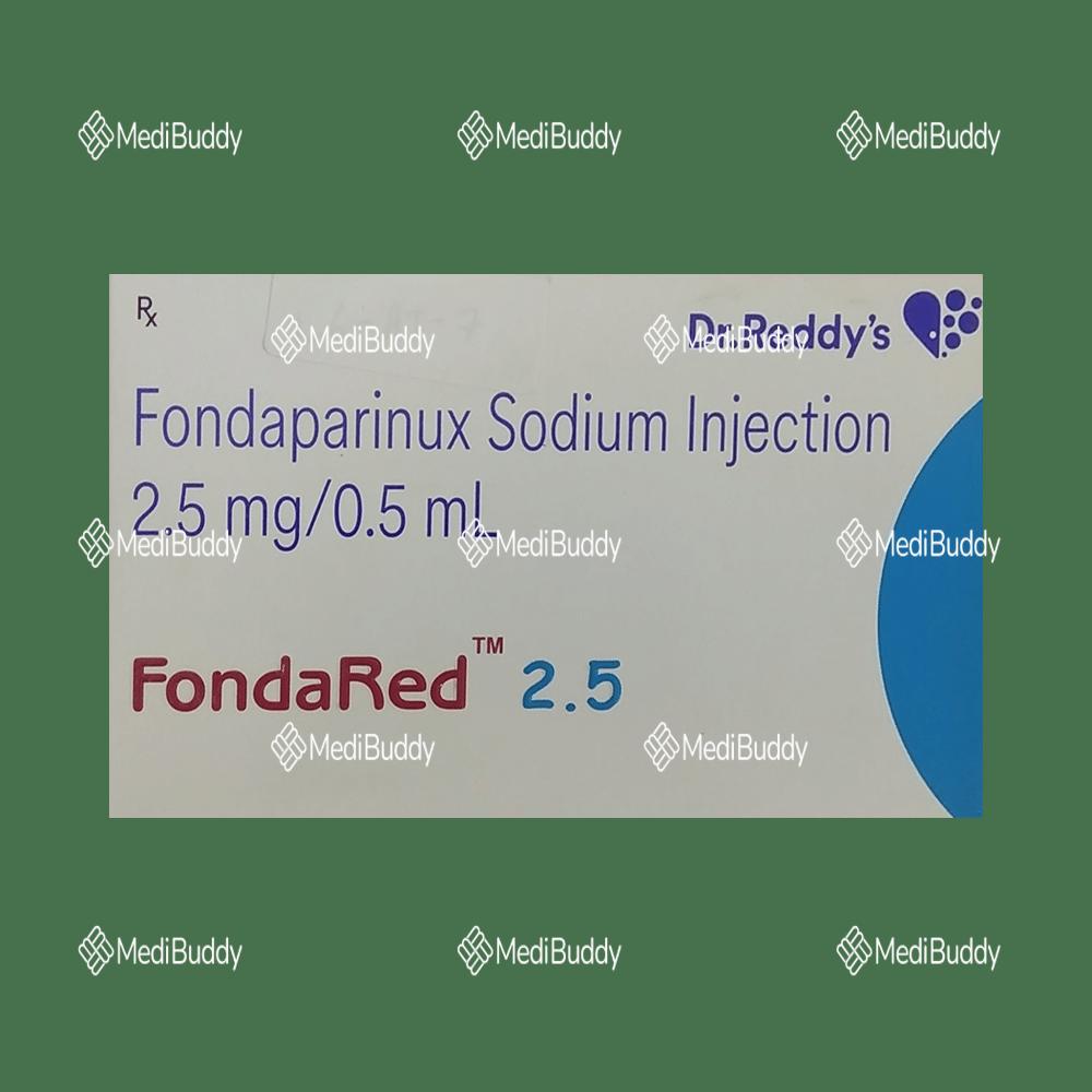 Fondared 2.5mg Injection is used to treat deep vein thrombosis (clots in leg veins) and pulmonary embolism (lung artery clots) by preventing harmful blood clot formation. It reduces clot risks post-surgeries or prolonged immobility. It must be administered by a doctor who will determine the dose and duration. Inform your doctor of any bleeding disorder, kidney or liver issues, pregnancy, or breastfeeding. Watch for bleeding signs and consult your doctor if side effects like bleeding or anemia persist. Proper lifestyle changes can enhance the medicine's effectiveness in preventing heart attacks or strokes.