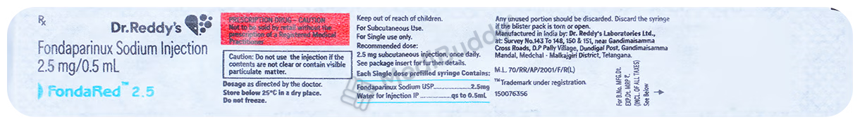 Fondared 2.5mg Injection, classified as an anticoagulant medicine, is utilized in the management of conditions like deep vein thrombosis, which is the presence of blood clots in the deep veins of the body, typically in the legs, and pulmonary embolism, where a blood clot obstructs the arteries in the lungs. This medication serves to hinder the formation of harmful blood clots within the blood vessels. It is particularly beneficial in individuals who have undergone knee or hip replacement surgeries or have been immobilized for extended periods.