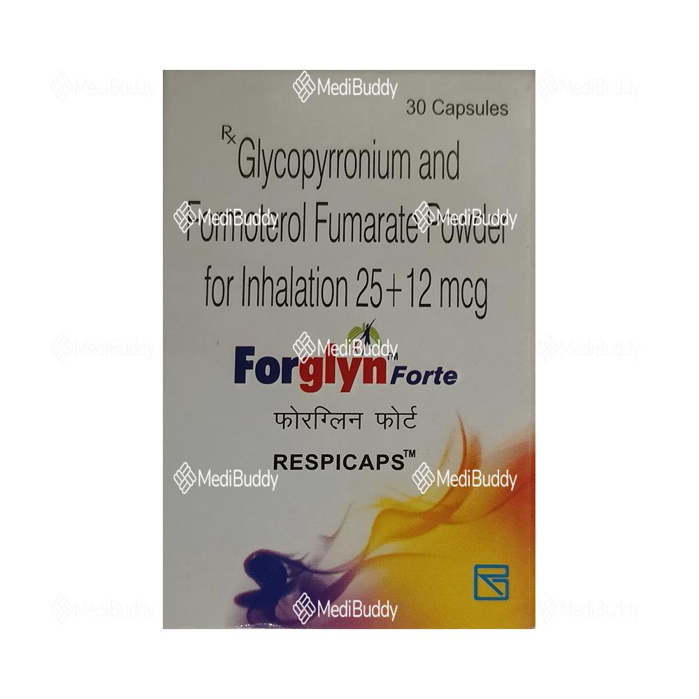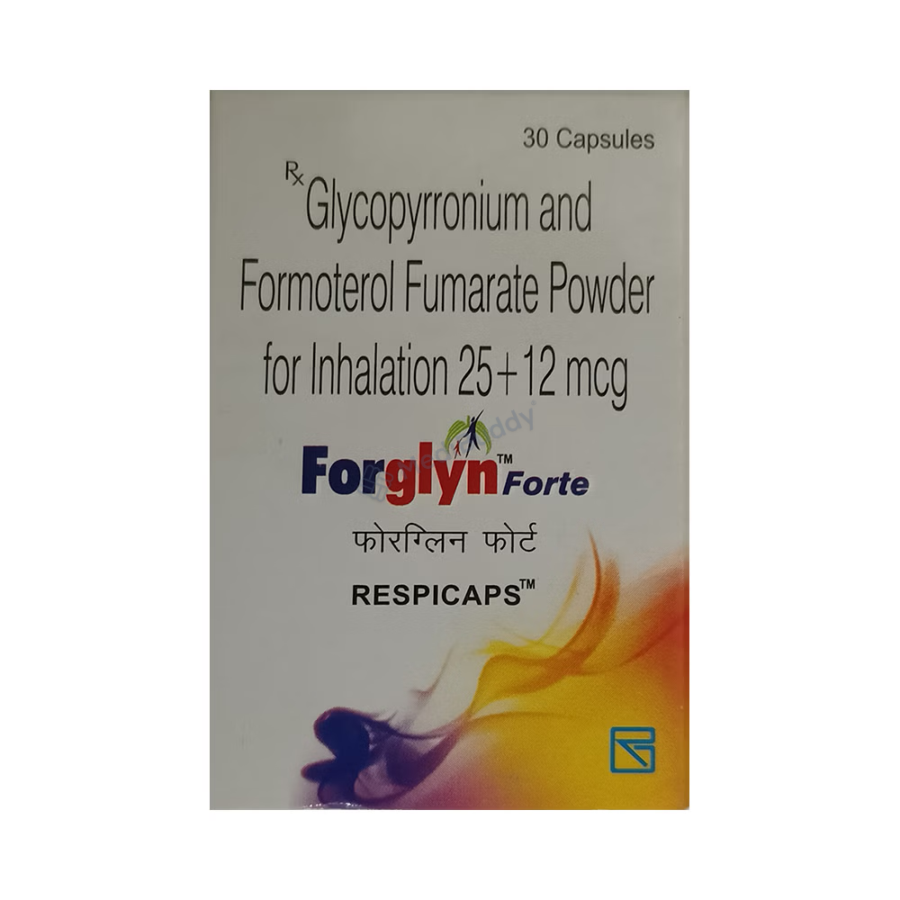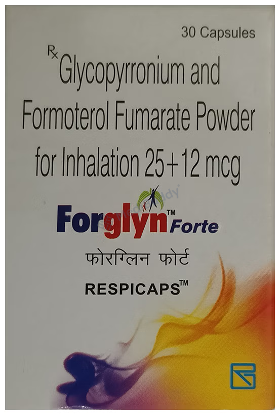 Forglyn Forte Respicaps 30's is categorized as a bronchodilator used for the maintenance treatment of COPD, which encompasses conditions like emphysema and chronic bronchitis. It contains two active ingredients: Formoterol fumarate, a long-acting beta2-adrenergic agonist, and Glycopyrronium, an anti-cholinergic, which work together to relax airway muscles and reduce secretions, thereby providing relief from COPD symptoms.