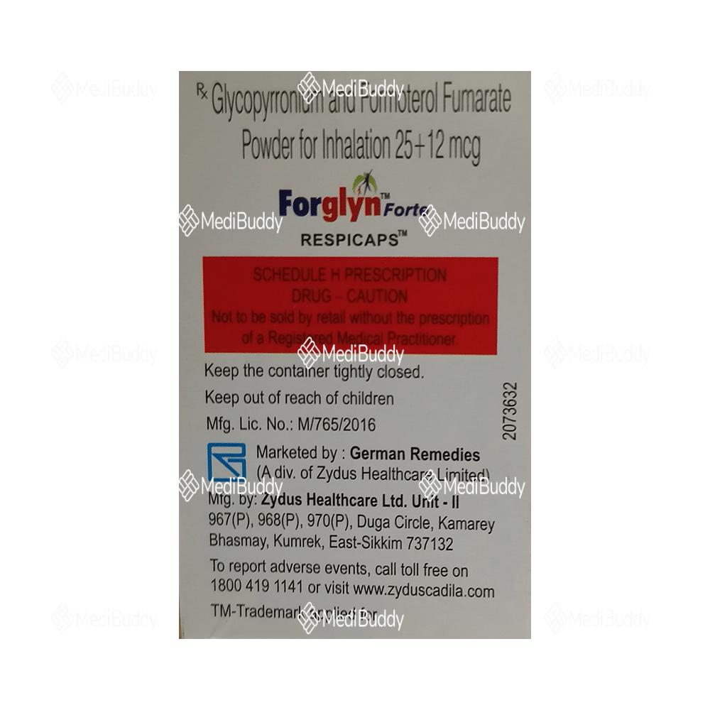 Forglyn Forte Respicap offers several benefits for individuals dealing with Chronic Obstructive Pulmonary Disease (COPD). By helping to keep the airways in the lungs open, this medication works by relaxing the muscles surrounding the airways. As a result, it becomes easier for air to flow in and out of the lungs, providing relief from symptoms such as chest tightness, shortness of breath, wheezing, and coughing. With the assistance of Forglyn Forte Respicap, individuals can experience improved breathing and find it easier to engage in their daily activities without being held back by COPD symptoms. This medication is not only safe but also effective, with quick onset of action within a few minutes and lasting effects that can span several hours. It is essential to follow your doctor's guidance and not discontinue usage without their advice to ensure optimal management of COPD symptoms. Forglyn Forte Respicap contains a combination of Formoterol fumarate and Glycopyrronium, both bronchodilators that work synergistically to provide relief from COPD. Formoterol fumarate acts as a long-acting beta-agonist to prevent airway muscle tightness, while Glycopyrronium, an anti-cholinergic, reduces airway secretions. Together, these components in Forglyn Forte Respicap help individuals manage COPD symptoms effectively, allowing for better quality of life and improved respiratory function.