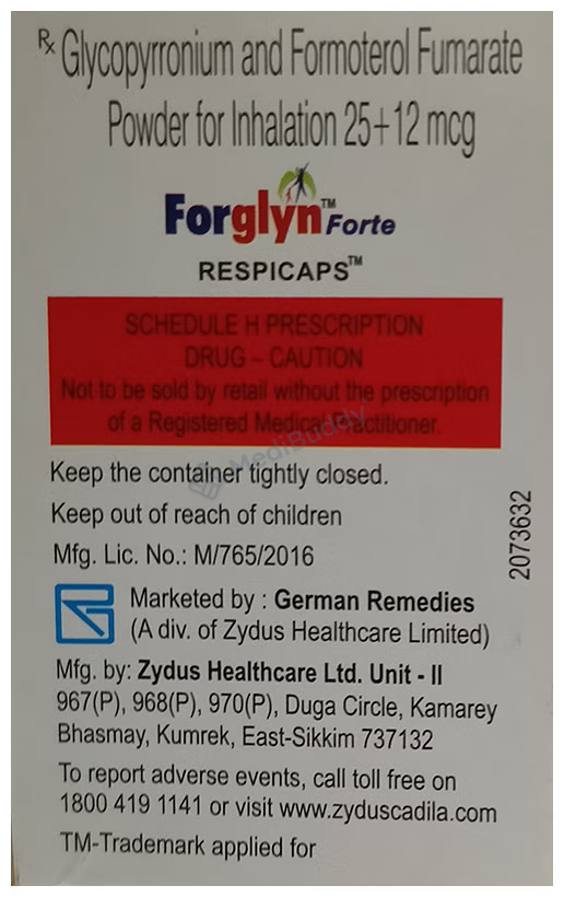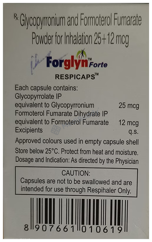 Forglyn Forte Respicap, a fixed-dose combination of formoterol and glycopyrronium, falls under the bronchodilator category and is specifically used for managing breathing difficulties in COPD patients. It is essential to note that this medication is not suitable for asthma patients or those with severe COPD conditions. Patients with certain medical conditions, including heart disease, high blood pressure, diabetes, thyroid disorder, epilepsy, urinary retention, and narrow-angle glaucoma, should use Forglyn Forte Respicap with caution. Additionally, individuals with milk protein allergies should avoid this medication, and pregnant or breastfeeding women should consult their healthcare provider before use.