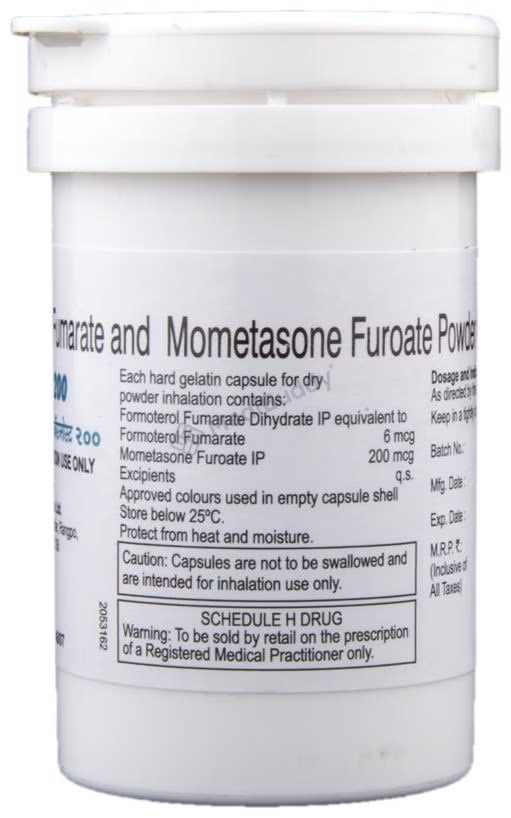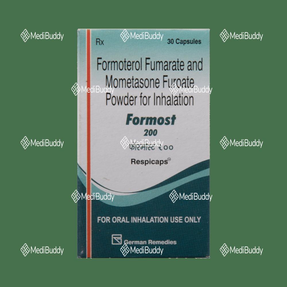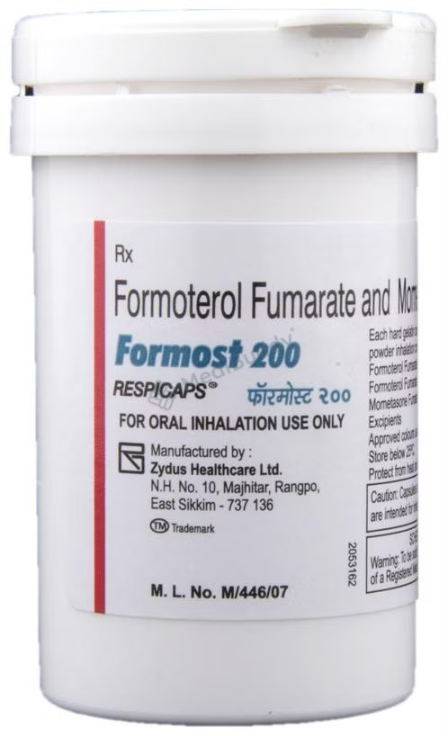 Common side effects of Formost 200 Respicap may include nausea, vomiting, respiratory tract infections, fungal infections in the mouth, dry mouth, headaches, hoarseness of voice, sore throat, cough, musculoskeletal pain, and an increased heart rate. If any of these side effects are experienced, it is advisable to consult with a doctor. Rinsing the mouth and throat with water or brushing teeth after using the inhaler may help prevent some of these symptoms. Additionally, rare but serious side effects may occur, and it is important to seek medical advice if any concerns arise. It is recommended to avoid triggers that worsen asthma symptoms and refrain from smoking when using this medication.