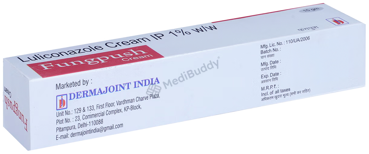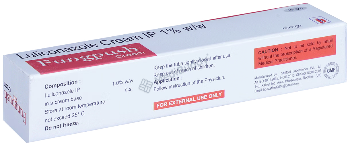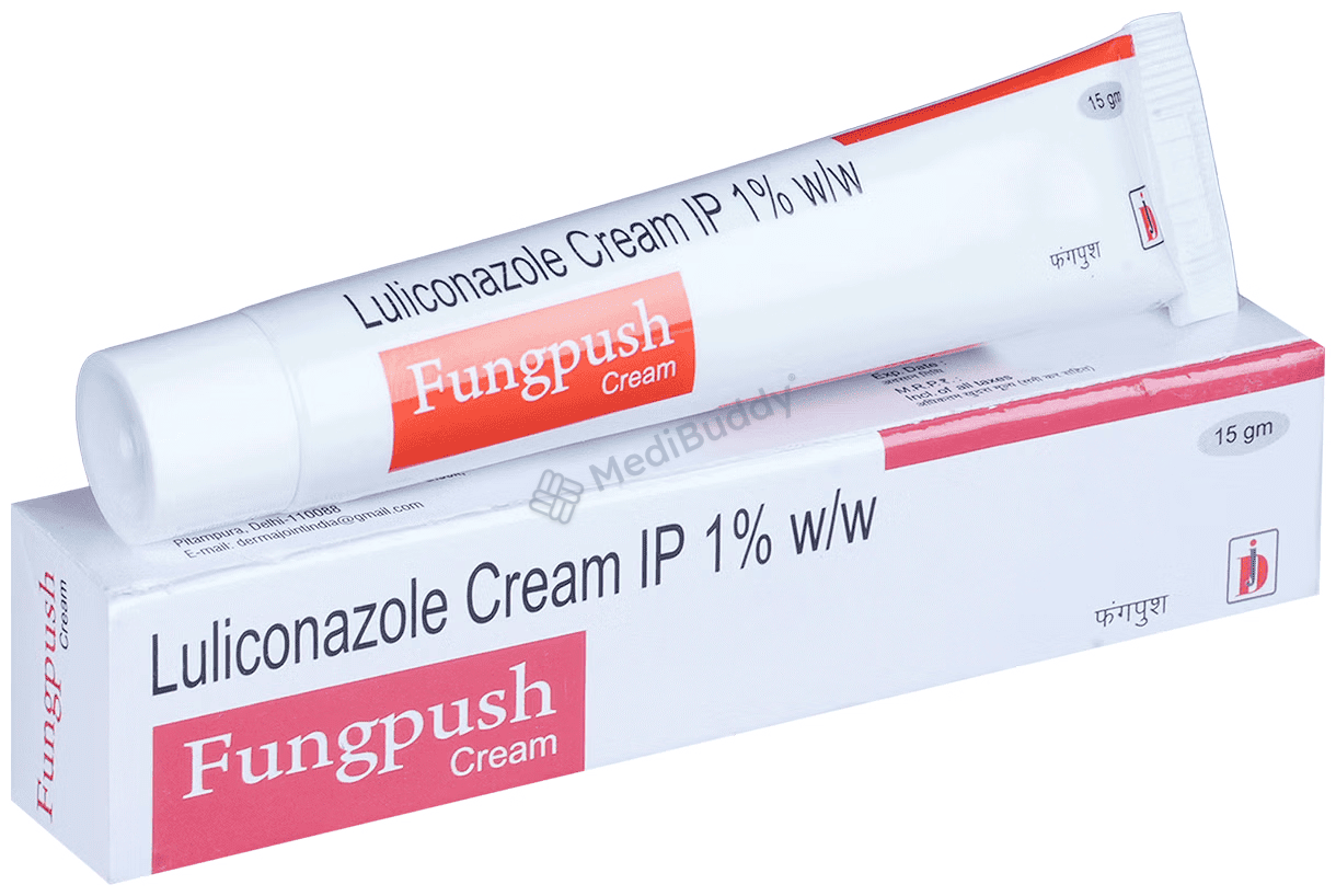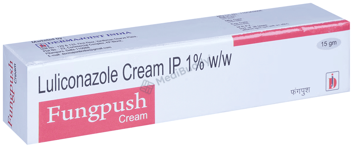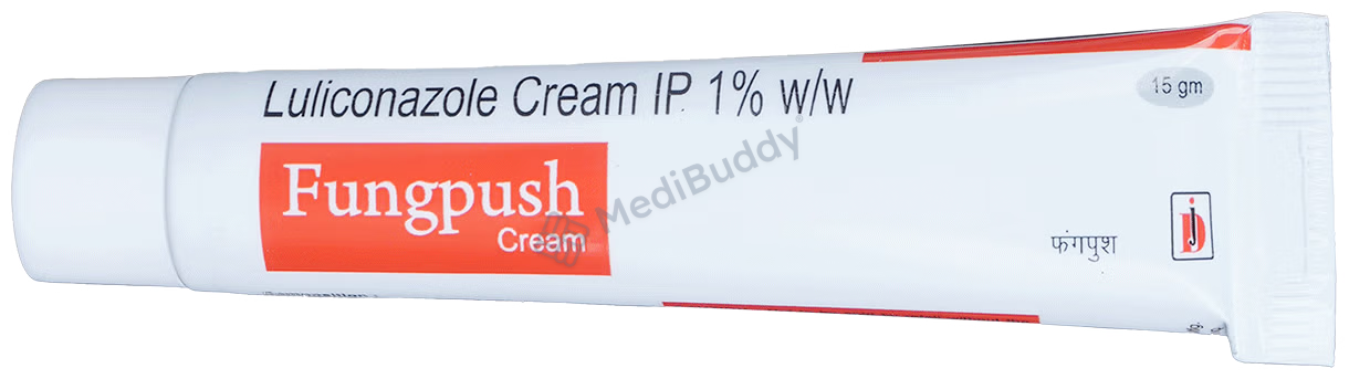 Fungpush 1%W/W Cream 15gm contains Luliconazole, an antifungal agent that works by creating holes in the fungal cell membranes, leading to their death. It is for external use only. Apply a thin layer of Fungpush Cream on the affected area after cleaning and drying it properly. Avoid contact with sensitive areas like the nose, mouth, eyes, or vagina. Side effects like redness, swelling, irritation, or burning sensation at the application site are common and usually do not require medical attention. If you are allergic to Fungpush Cream or any other medications, pregnant, breastfeeding, or have allergies to preservatives, foods, or dyes, it is recommended to consult your doctor before using Fungpush Cream. This cream is not recommended for children under 12 years for athlete’s foot or jock itch but may be used in children above 2 years for ringworm under doctor's supervision.
