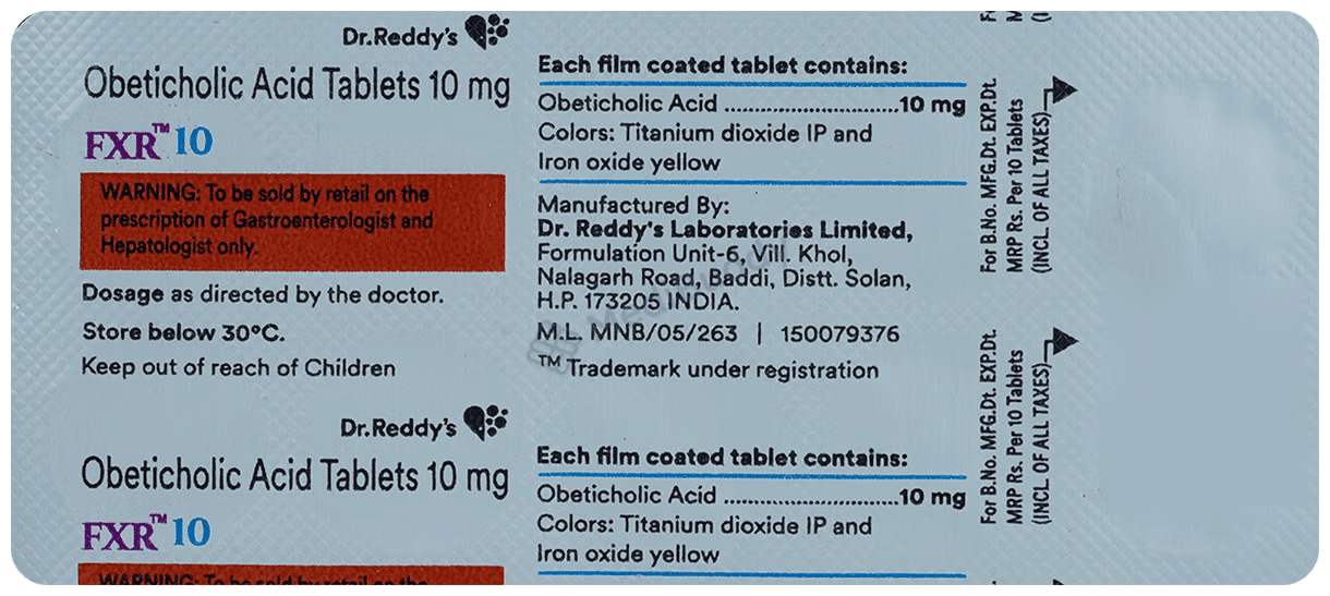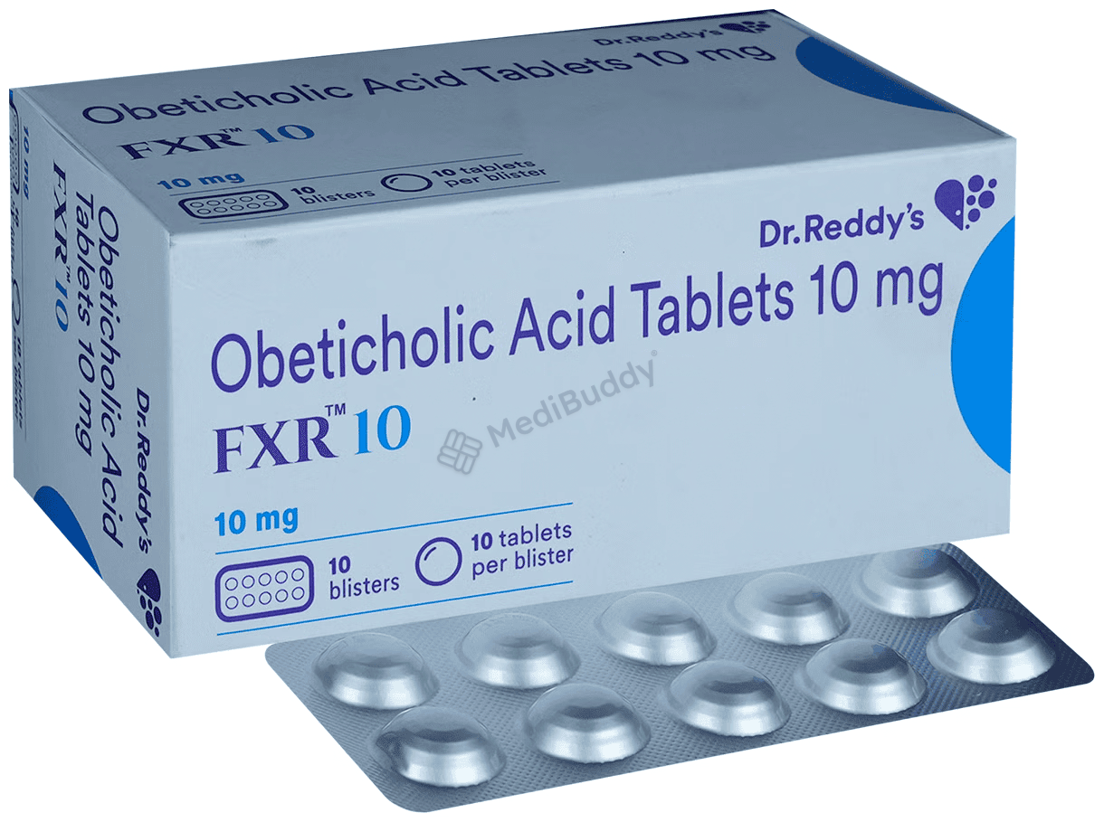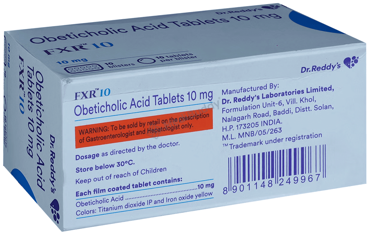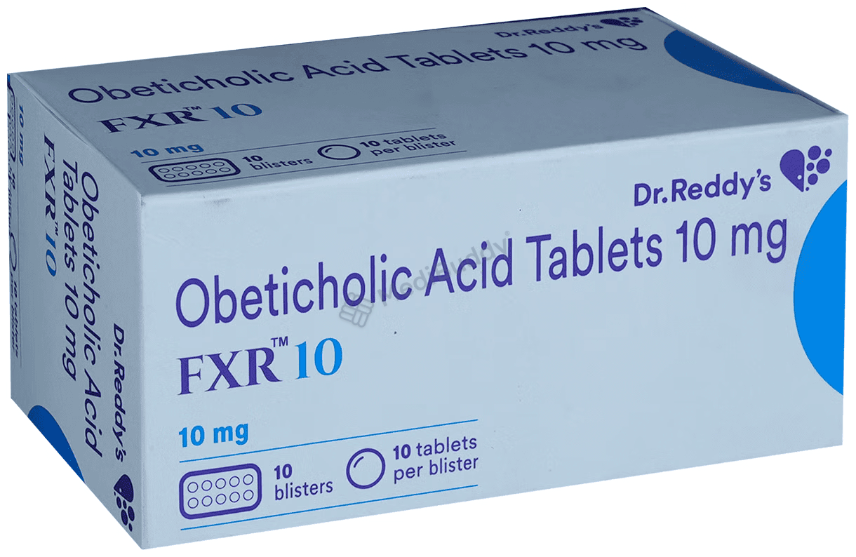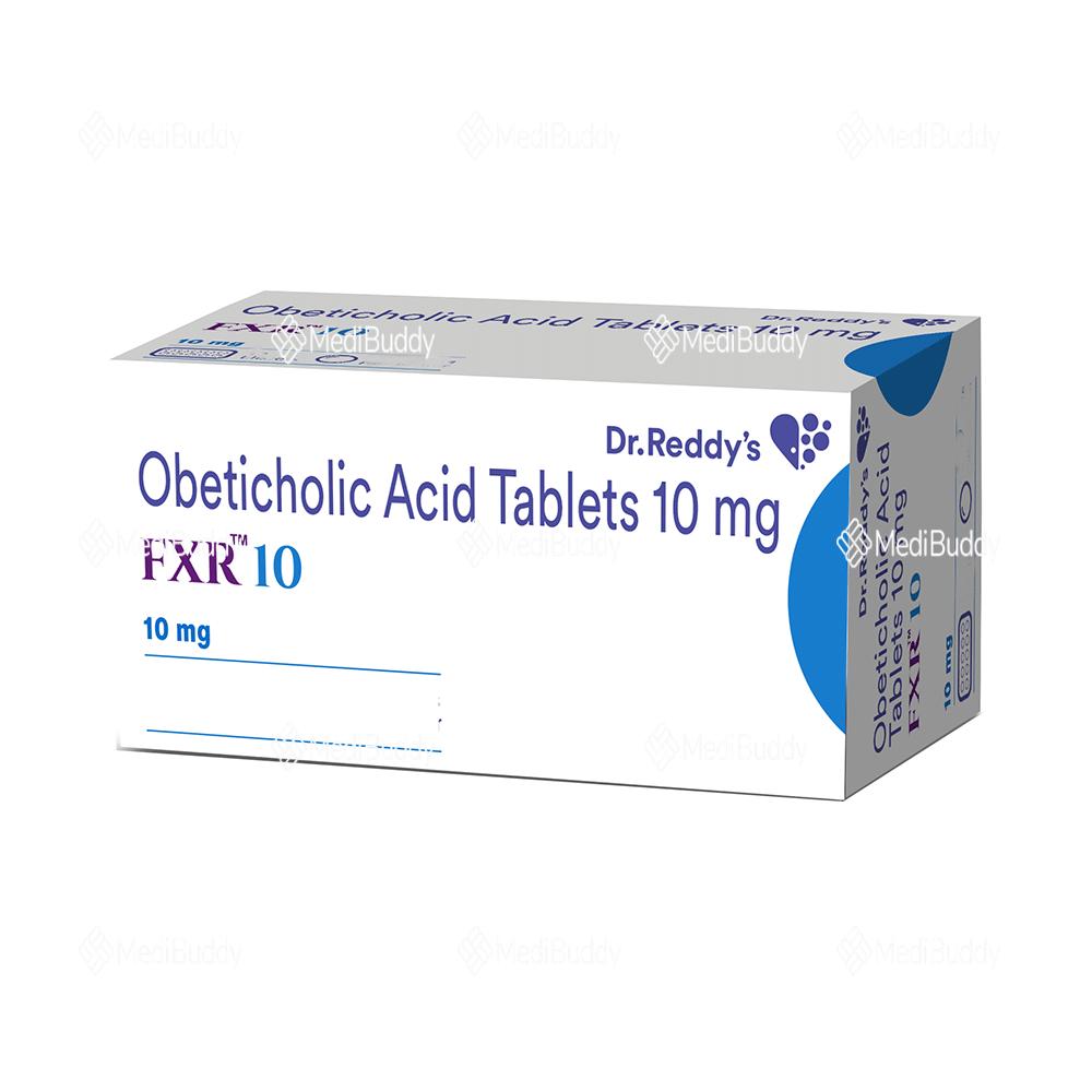 FXR 10 Tablet, also known as FXR 10 Tablet 10's or FXR 10MG, is a medication used to treat primary biliary cirrhosis, a condition in which bile ducts in the liver are damaged, resulting in bile build-up and liver damage. This medication contains Obeticholic acid, a Farnesoid X receptor agonist that helps improve liver function by reducing bile production and build-up while increasing bile removal and reducing inflammation in the liver. By doing so, FXR 10 Tablet aids in treating primary biliary cirrhosis.