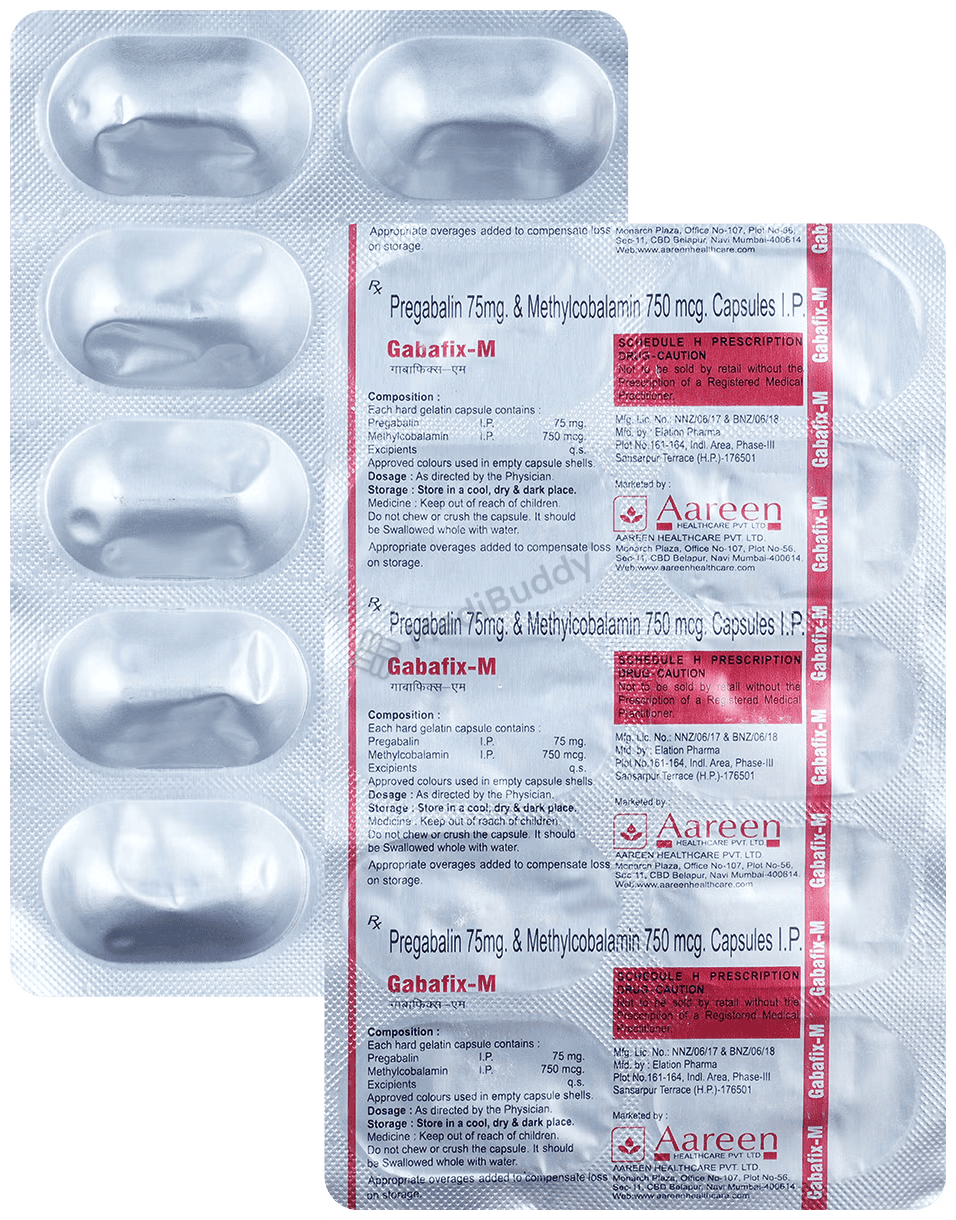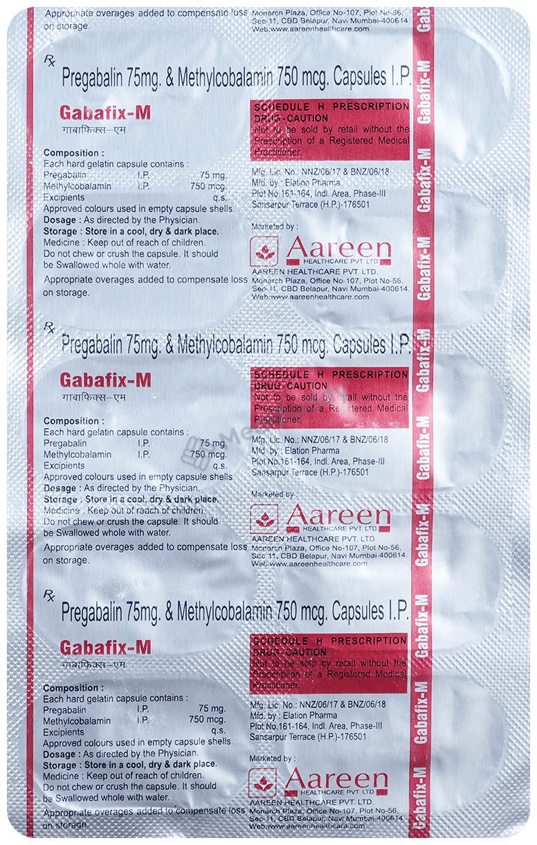 Gabafix-M 750mcg/75mg Capsule is a prescribed medication mainly used for treating neuropathic pain. It works to reduce pain by adjusting the calcium channel activity in the nerve cells. Additionally, this medication plays a role in safeguarding nerve fibers and promoting the healing of damaged nerve cells.