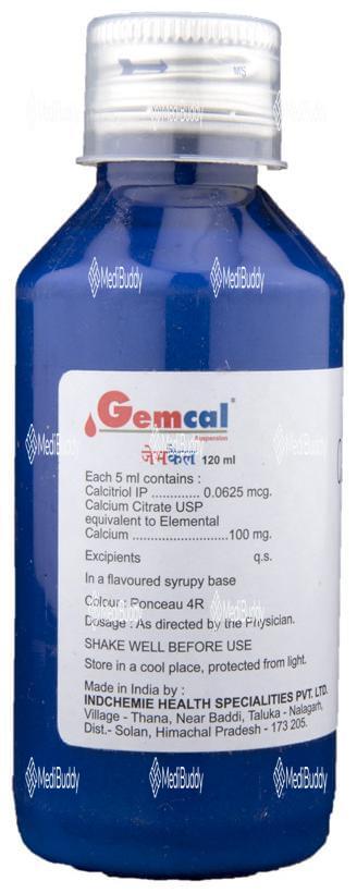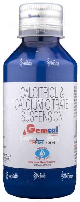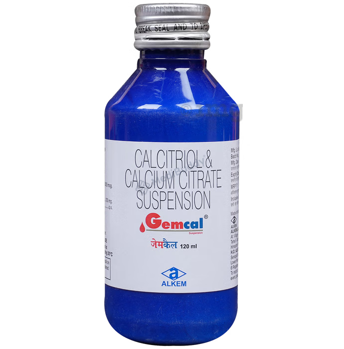 Gemcal Suspension is available in syrup form and is suitable for adults. It belongs to the class of 'vitamins' and is primarily used to treat conditions caused by low calcium levels in the body, including Vitamin D deficiency, osteoporosis, and other related disorders. It consists of calcium and calcitriol, with calcium helping to prevent or treat calcium deficiencies and maintain bone formation. Calcitriol, a synthetic form of Vitamin D, aids in regulating blood calcium and phosphorus levels as well as bone mineralization. While generally safe to use, Gemcal Suspension may cause side effects like constipation and stomach upset in some cases, which usually resolve over time. It is essential to inform your doctor about any other medications or herbal products you are using before starting Gemcal Suspension. Additionally, individuals with specific health conditions such as hypercalcemia, hypervitaminosis D, malabsorption syndrome, or certain imbalances should consult a healthcare professional before using Gemcal Suspension, especially during pregnancy or breastfeeding.