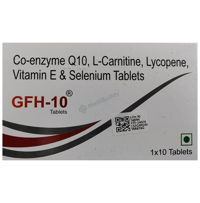 Introducing GFH 10 Tablet - a unique blend of active ingredients including Coenzyme Q10, L-Carnitine, Lycopene, L-Arginine, Vitamin E, and Selenium, designed to enhance overall growth and support reproductive health. This supplement is specifically formulated to address various health concerns and promote general well-being.