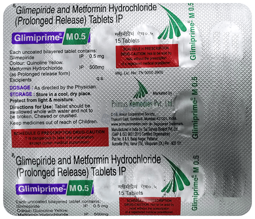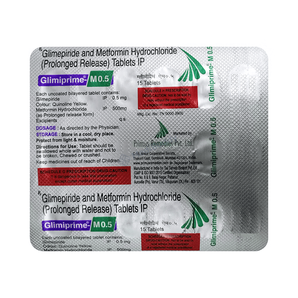 Glimiprime M 0.5 Tablet PR is a medication classified as an anti-diabetic drug, specifically designed to tackle type 2 diabetes mellitus in adult patients. This combination medicine aids in regulating blood sugar levels in individuals with diabetes. It is crucial to take Glimiprime M 0.5 Tablet PR with food consistently at the same time every day for optimal results. Dosage adjustments may be made by your doctor based on how effectively it controls your blood sugar levels.