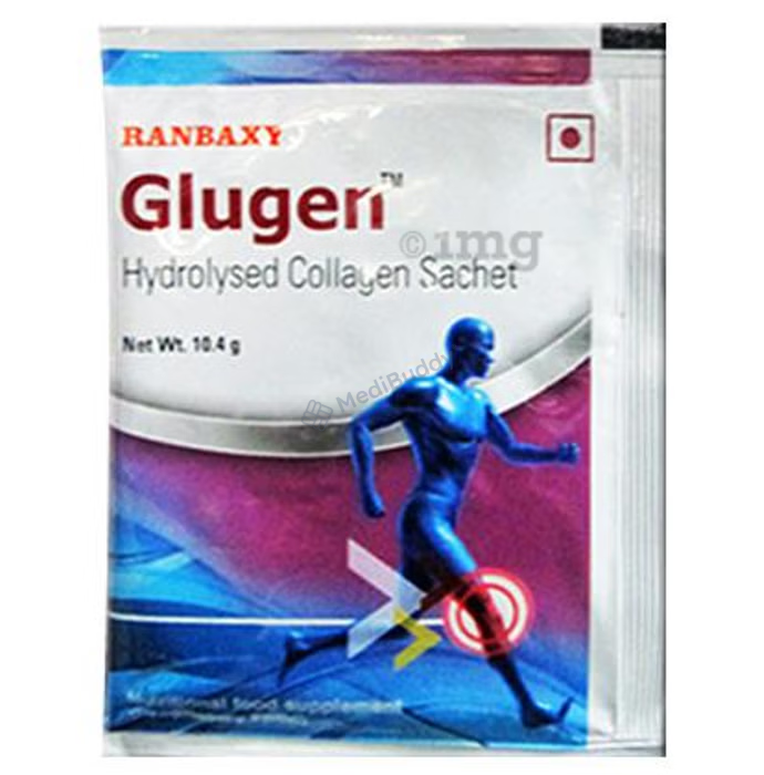 Glugen Sachet is a nutritional supplement containing Collagen Hydrolysate as its key ingredient. Collagen Hydrolysate is a type of protein that is known for its various health benefits, particularly in the treatment of conditions such as osteoarthritis, rheumatoid arthritis, osteoporosis, and other joint disorders. This protein is easily digestible, making it a popular choice for those looking to support their joint health and facilitate faster recovery from sport-related injuries.