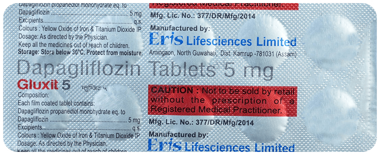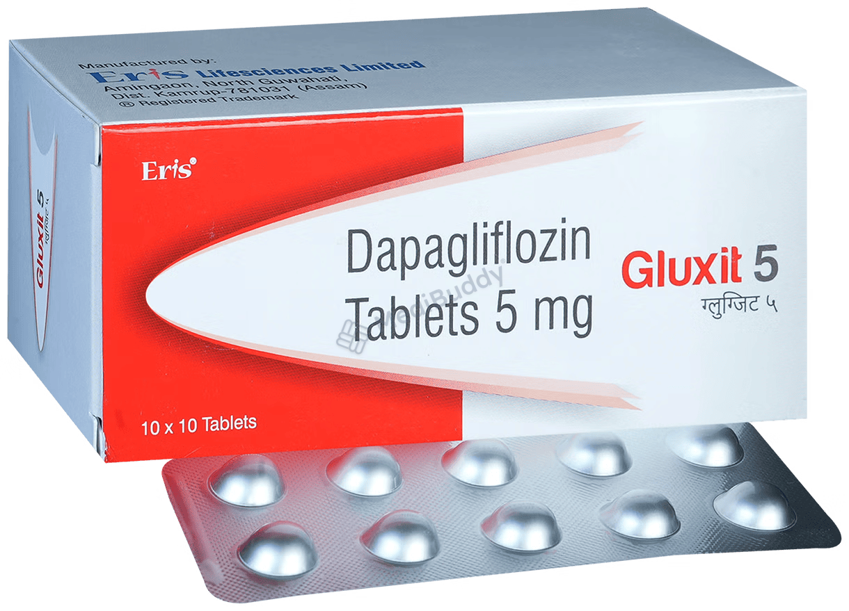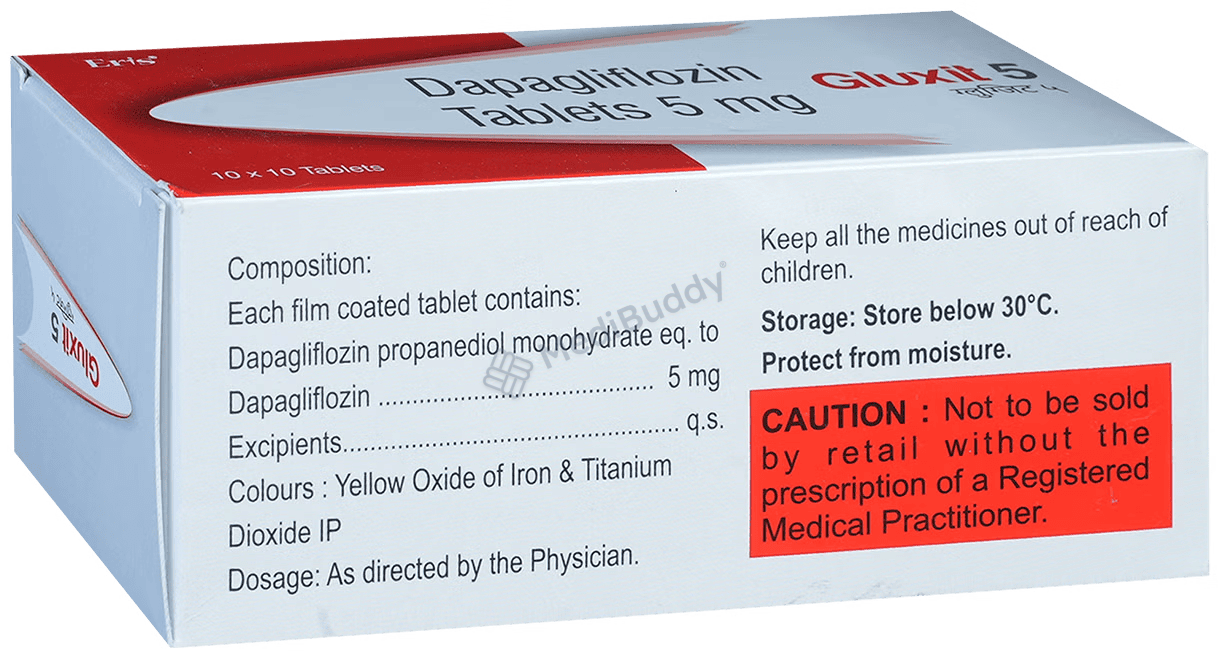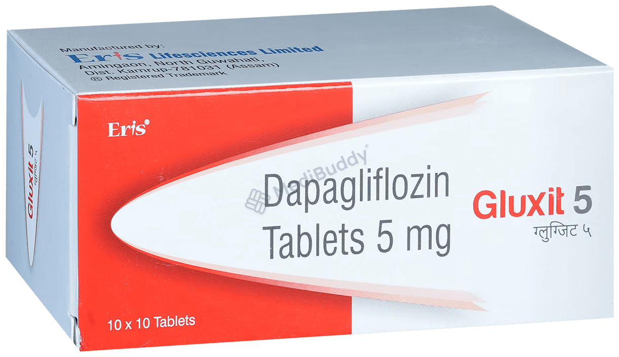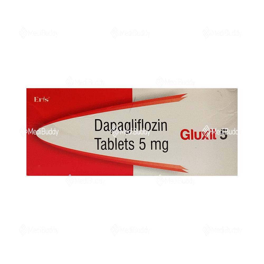Gluxit 5mg Tablet contains Dapagliflozin, an SGLT-2 inhibitor that helps increase the excretion of glucose through urine, thereby lowering blood sugar levels. It is crucial to take the medication as prescribed by your doctor and be mindful of potential side effects like urinary tract infections, hypoglycemia, increased thirst, and skin rash. Inform your doctor of any allergies to the components of this medication and any existing kidney or liver conditions before starting treatment.
