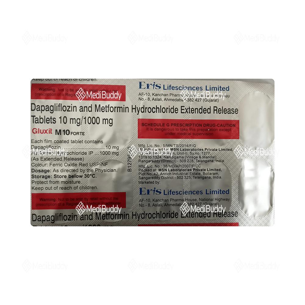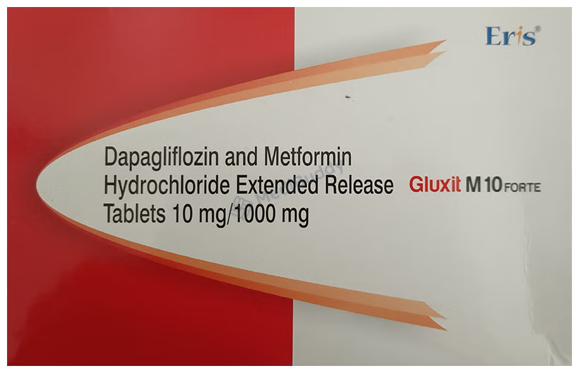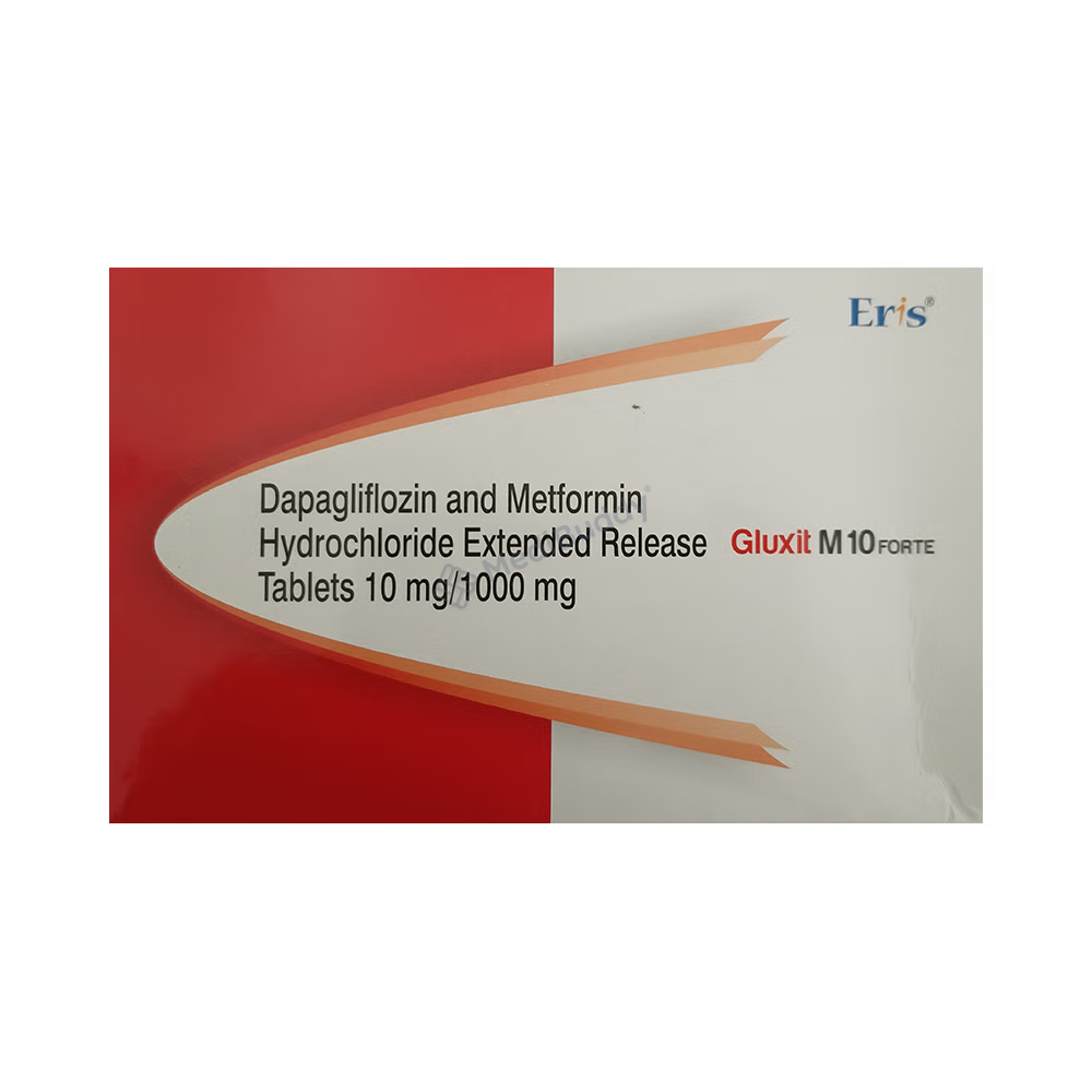 Gluxit M 10 Forte Tablet ER is a medication primarily prescribed to manage type 2 diabetes mellitus in conjunction with a balanced diet and regular physical activity. This medication aids in controlling elevated blood sugar levels linked with diabetes, thereby reducing the risk of severe diabetic complications and helping prevent heart disease. The composition of Gluxit M 10 Forte Tablet ER includes two antidiabetic agents, Metformin and Dapagliflozin, each with distinct mechanisms of action to regulate blood glucose levels effectively.