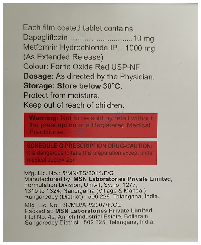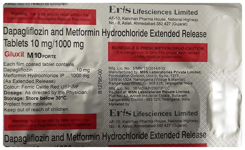 Metformin, a biguanide, works by enhancing the body's sensitivity to insulin, particularly beneficial for overweight individuals. It acts independently of the pancreas to lower blood sugar levels without stimulating excess insulin production. On the other hand, Dapagliflozin, classified as a gliflozin, aids in reducing blood sugar levels by promoting the excretion of surplus glucose via urine. It is crucial to follow your healthcare provider's dosage instructions precisely while taking Gluxit M 10 Forte Tablet ER to ensure its effectiveness and avoid abrupt discontinuation, which may elevate blood sugar levels and predispose you to serious complications such as kidney damage and vision impairment.