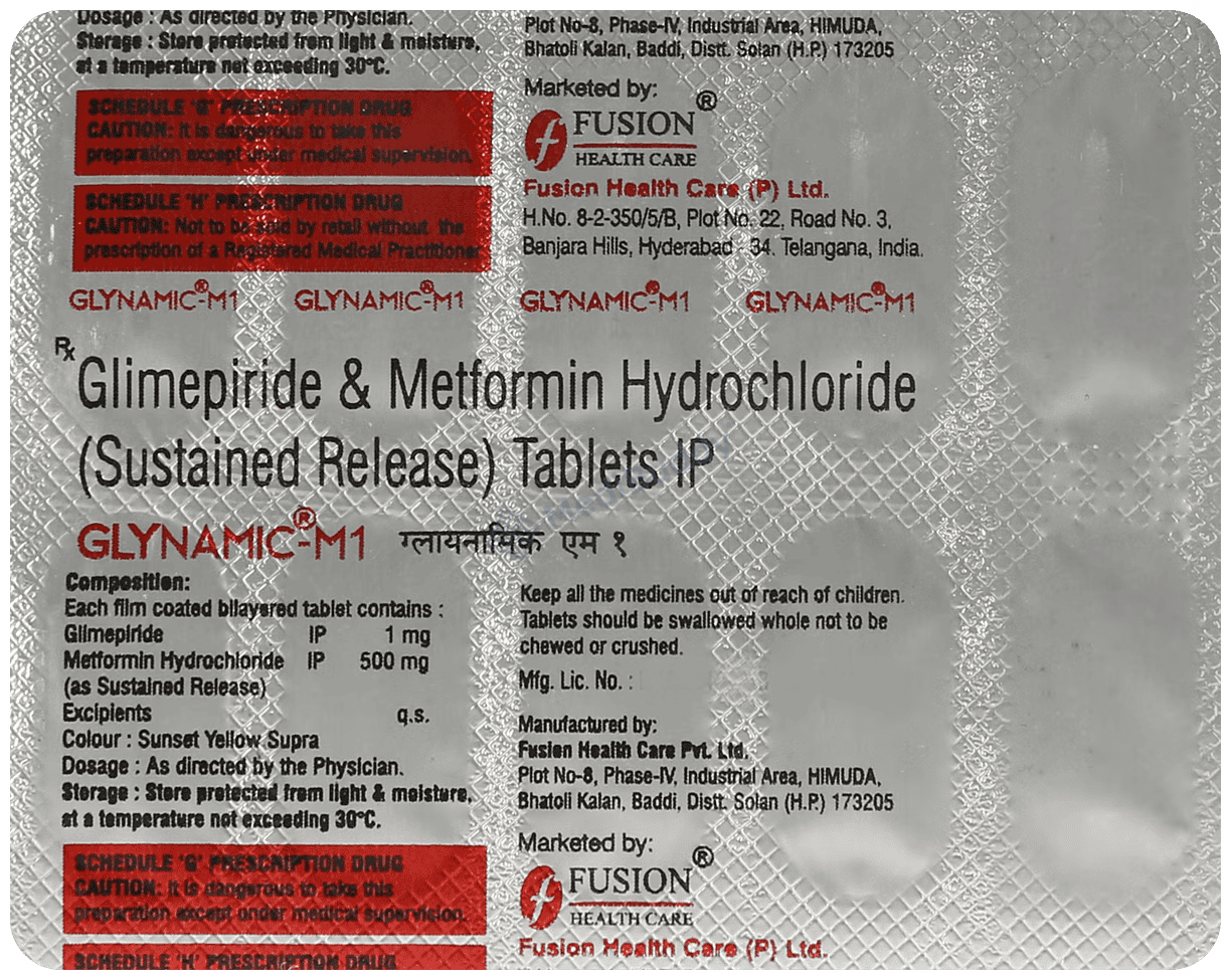 Glynamic M 1mg/500mg Tablet is used in the treatment of type 2 diabetes mellitus in adults. It helps in controlling blood sugar levels by increasing the insulin production in the body. This medication should be taken daily with food at the same time each day. It is crucial to follow your doctor's prescribed dose to effectively manage your diabetes and minimize risks of complications like kidney damage, eye problems, nerve issues, and limb loss. Incorporating a healthy diet and regular exercise is essential for managing diabetes effectively. Remember to check your blood sugar levels regularly as advised by your doctor.